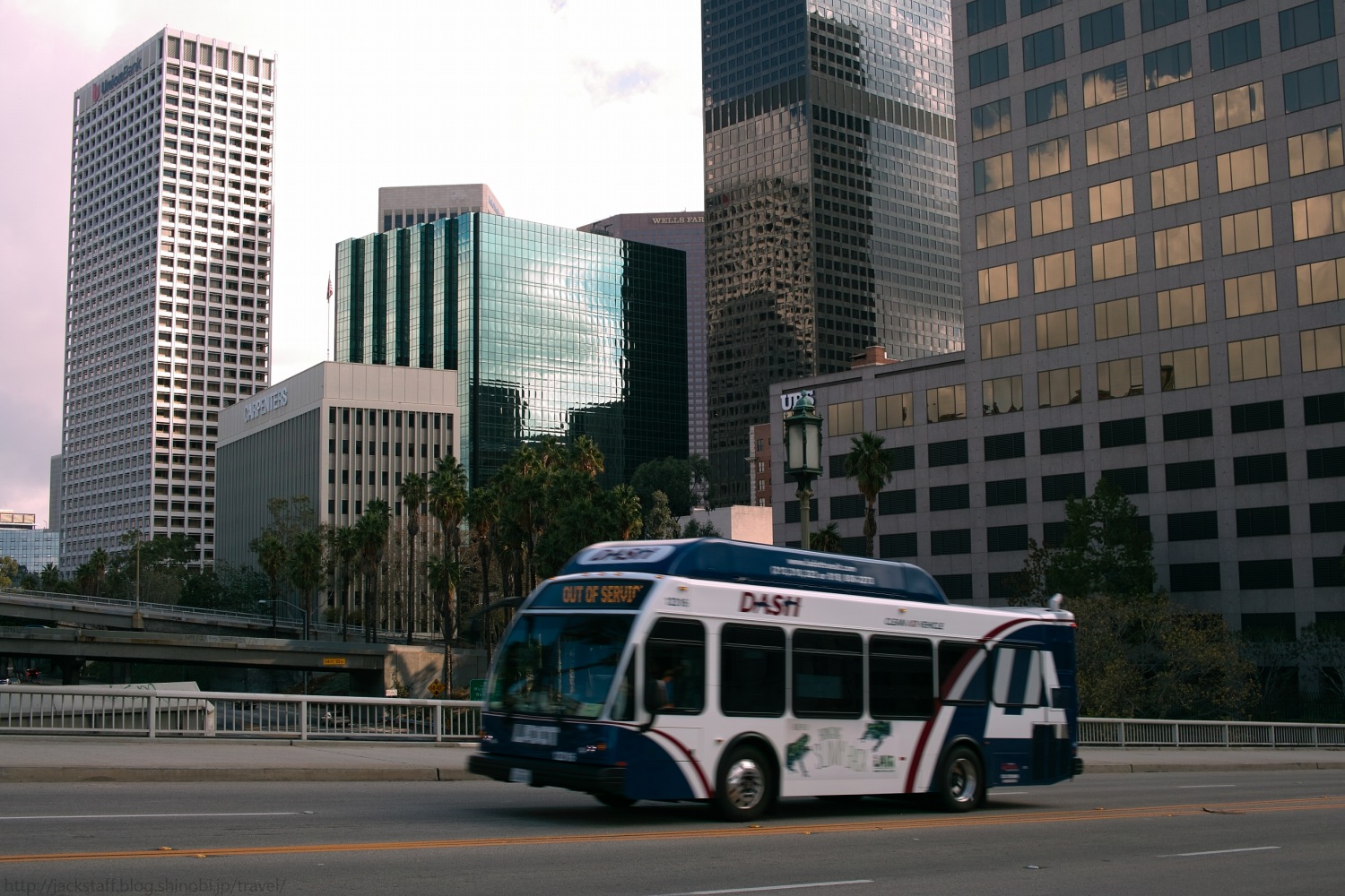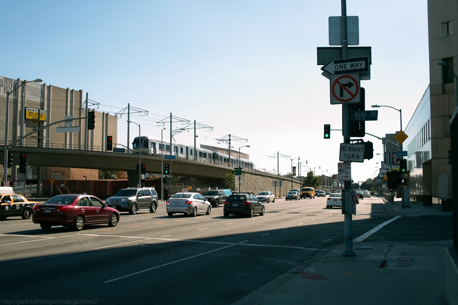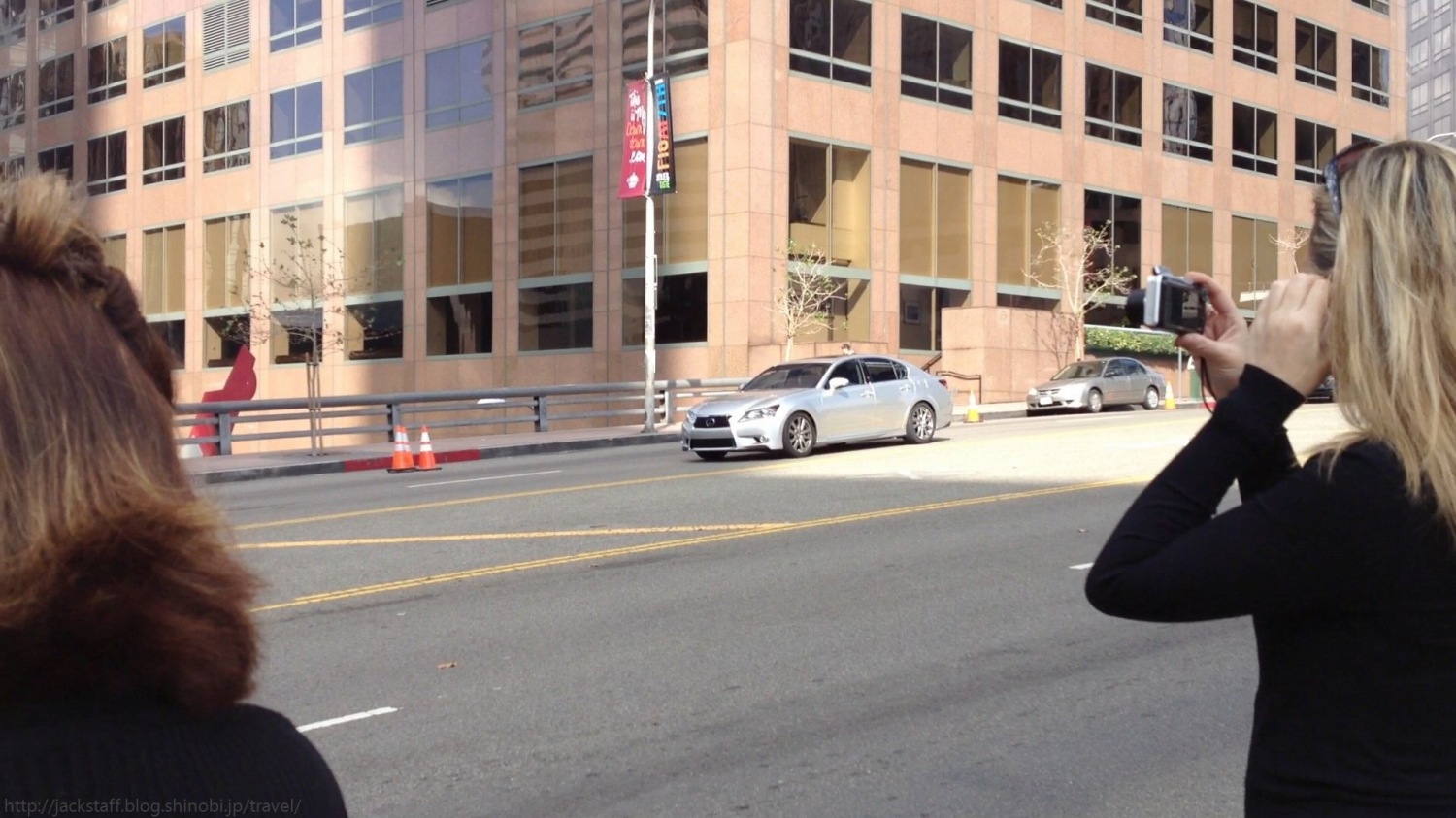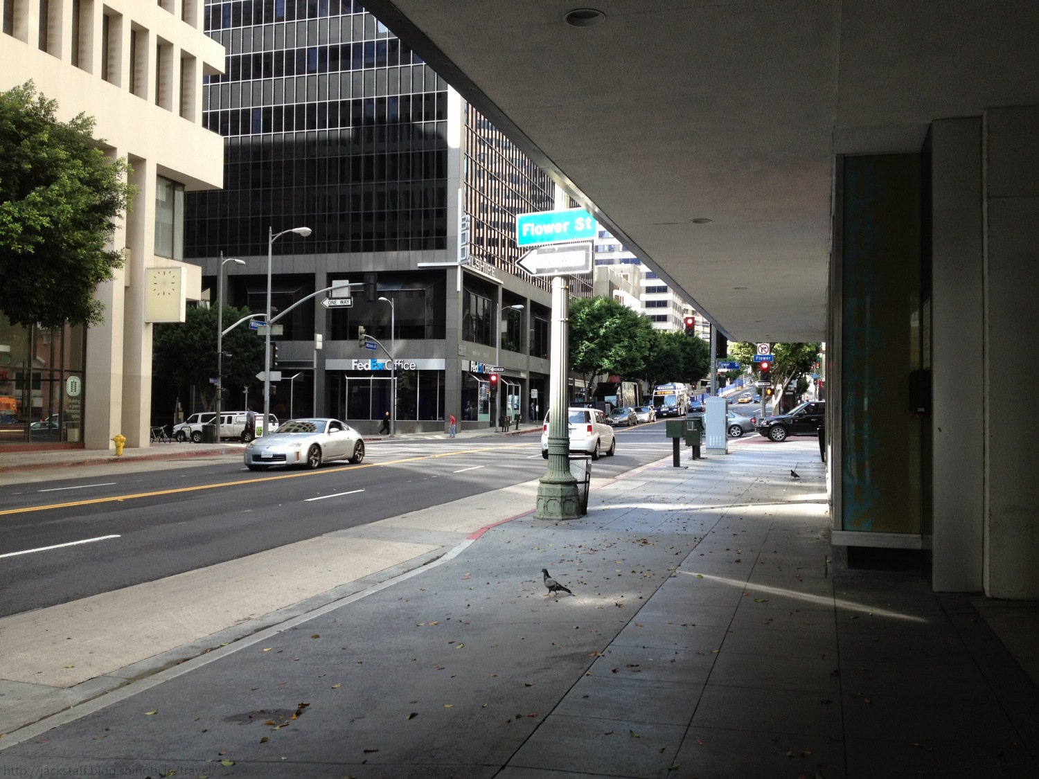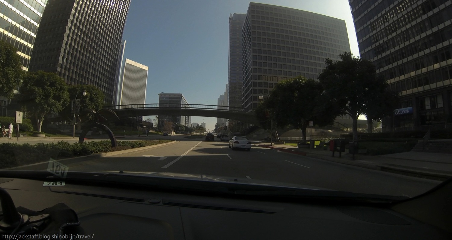 中:ダウンタウンを走るバス、DASHだ。たった25セントで乗ることが出来る。 右:ウィルシャー・ブールヴァードとフラワー・ストリートの交差点。 ダウンタウン中心地、平日の昼間だからか歩いている人もまばらでどこか落ち着いた雰囲気が漂っている。 ウエスト・4thストリートを跨ぐサウス・グラント・アヴェニューの高架橋の上に差し掛かったところでマットブラックのカメラカーに続いてスポーツタイプのセダンがドリフトをしながら交差点を曲がっていった。白昼の街中でカーアクションの撮影が行われているようだ。 写り込むんじゃないかと思い、反射的にエキストラ役に徹したが周りでは携帯で撮影している人も居て歩行者は問題無さそうだ。 左:恐らくレクサスだと思われるこの車両がソロで行ったり来たりして撮影が行われていた。