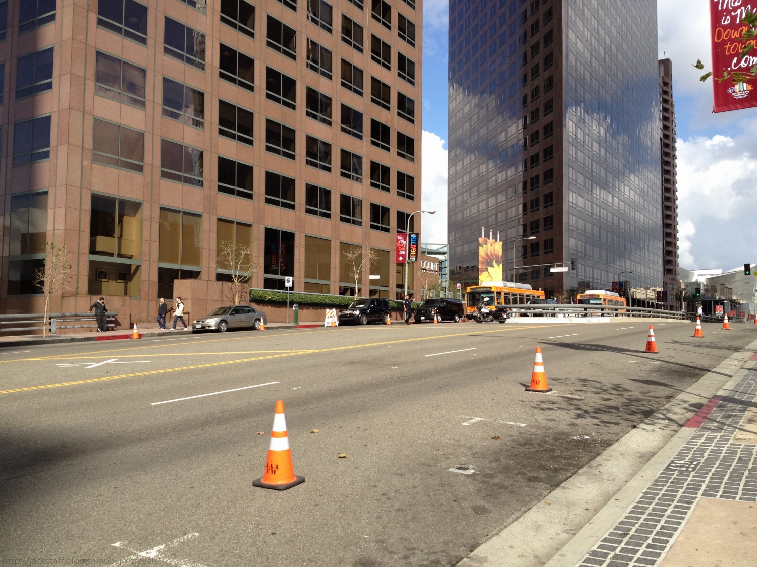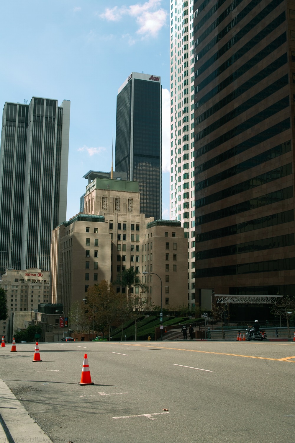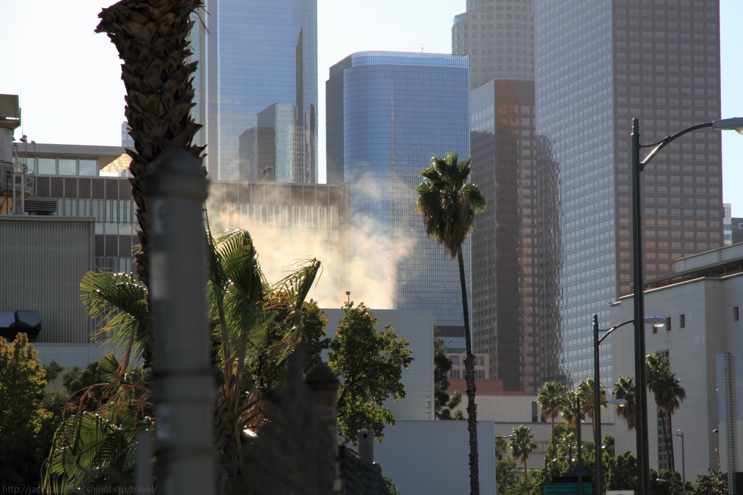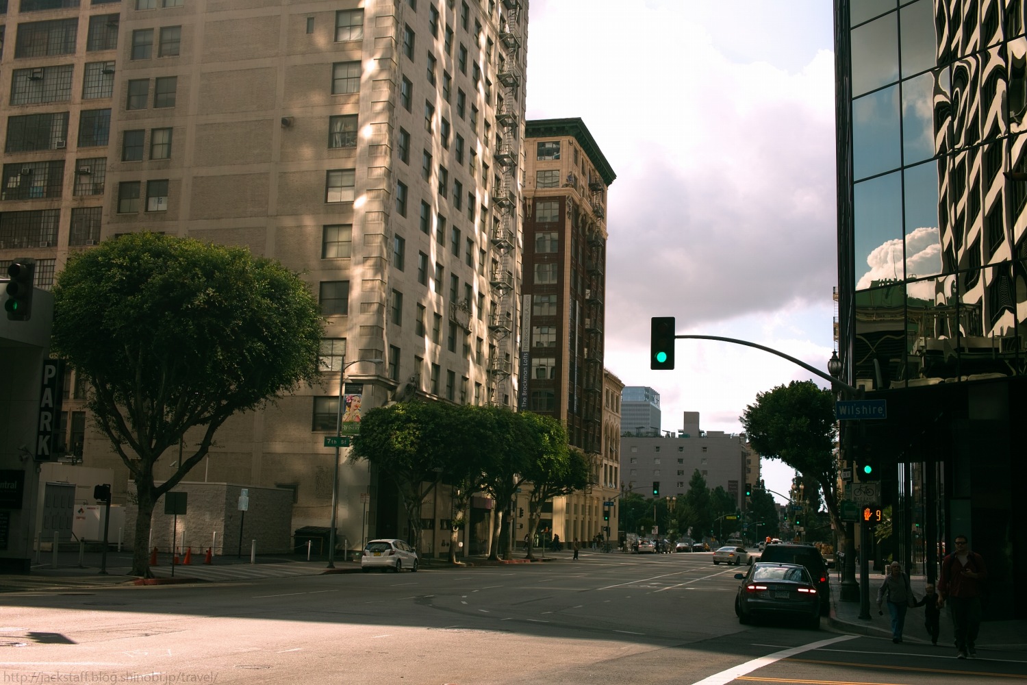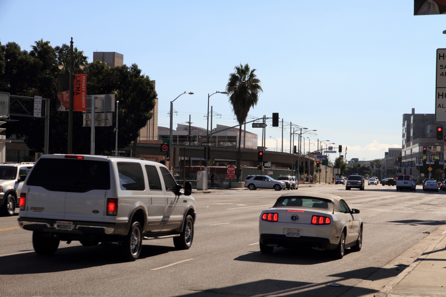 中:ダウンタウンを走るバス、DASHだ。たった25セントで乗ることが出来る。 右:ウィルシャー・ブールヴァードとフラワー・ストリートの交差点。 ダウンタウン中心地、平日の昼間だからか歩いている人もまばらでどこか落ち着いた雰囲気が漂っている。 ウエスト・4thストリートを跨ぐサウス・グラント・アヴェニューの高架橋の上に差し掛かったところでマットブラックのカメラカーに続いてスポーツタイプのセダンがドリフトをしながら交差点を曲がっていった。白昼の街中でカーアクションの撮影が行われているようだ。 写り込むんじゃないかと思い、反射的にエキストラ役に徹したが周りでは携帯で撮影している人も居て歩行者は問題無さそうだ。 左:恐らくレクサスだと思われるこの車両がソロで行ったり来たりして撮影が行われていた。