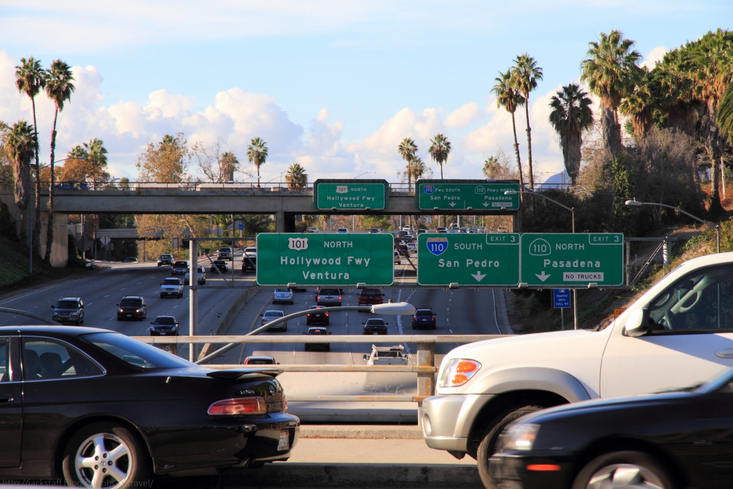ダウンタウン 左:ウィルシャー・ブールヴァードから見たハーバー・フリーウェイ、奥にそびえ立つのがザ・リッツ・カールトンだ。