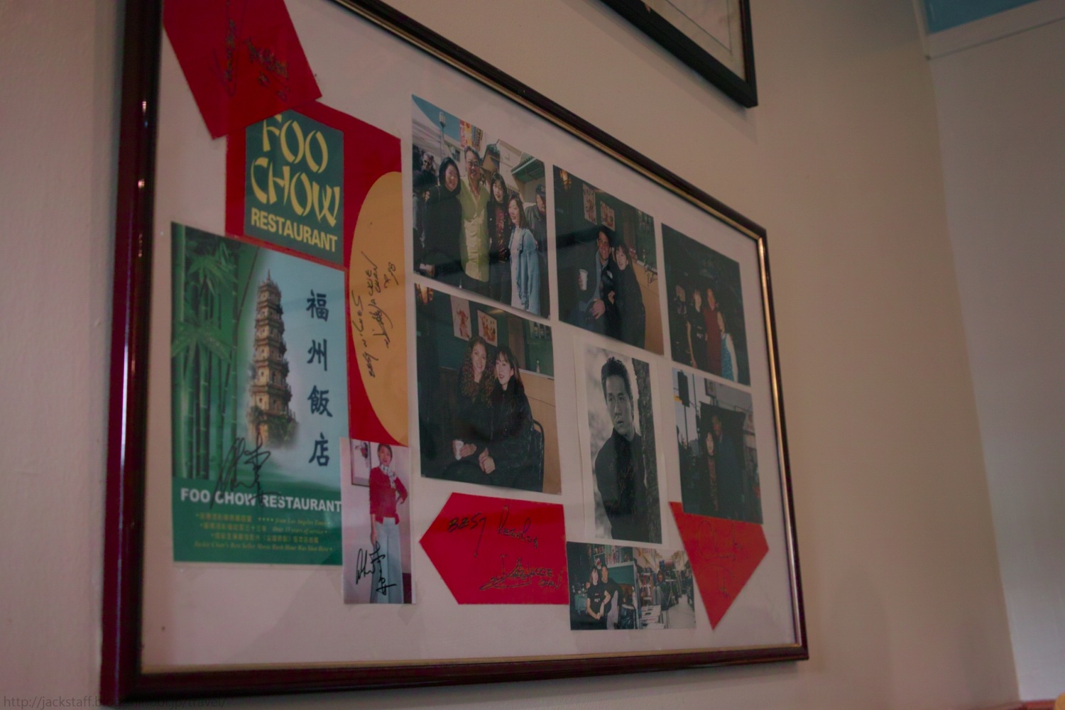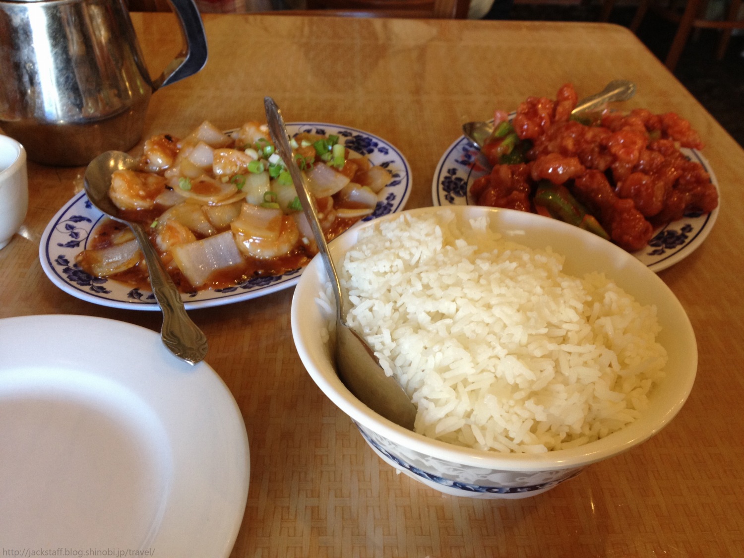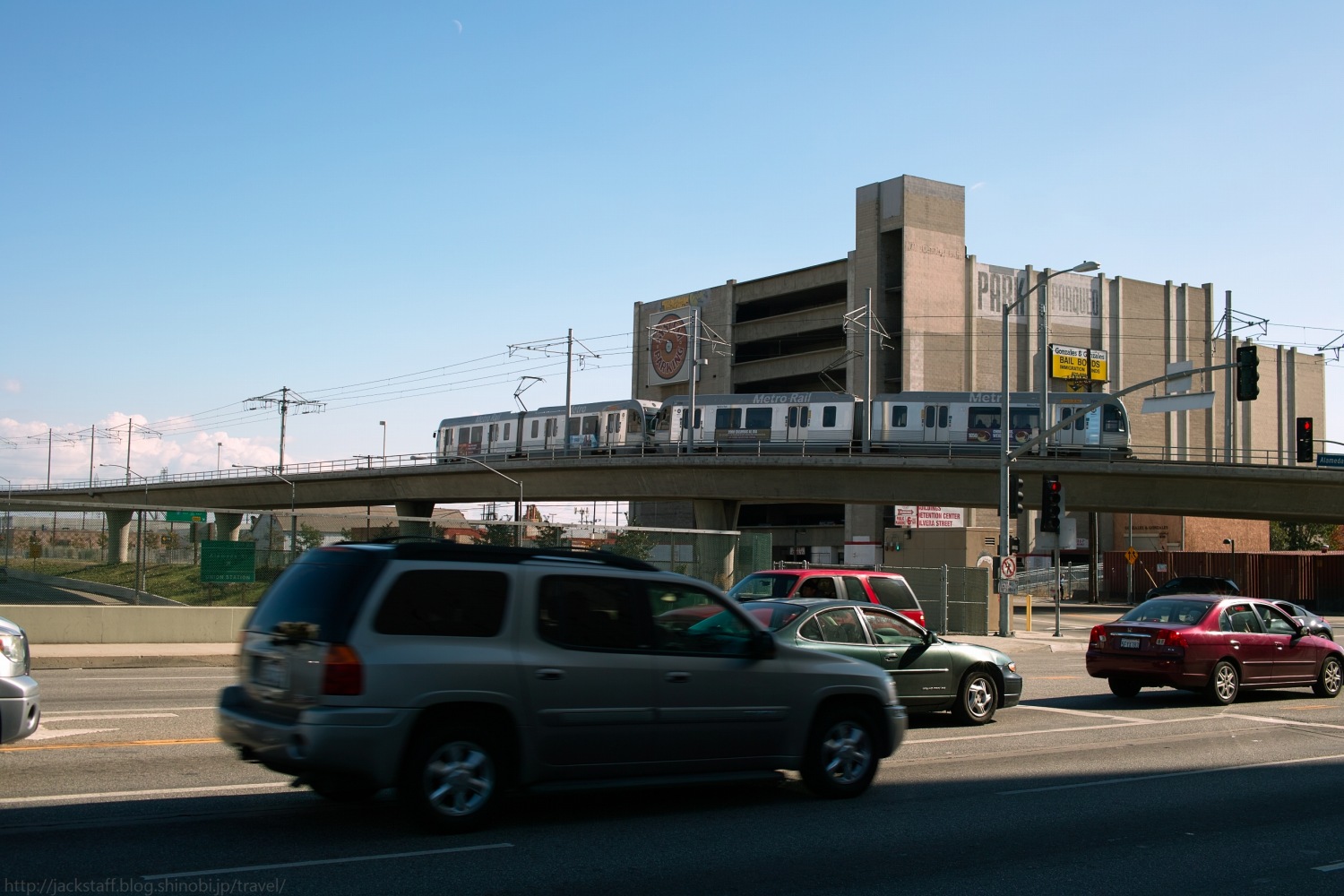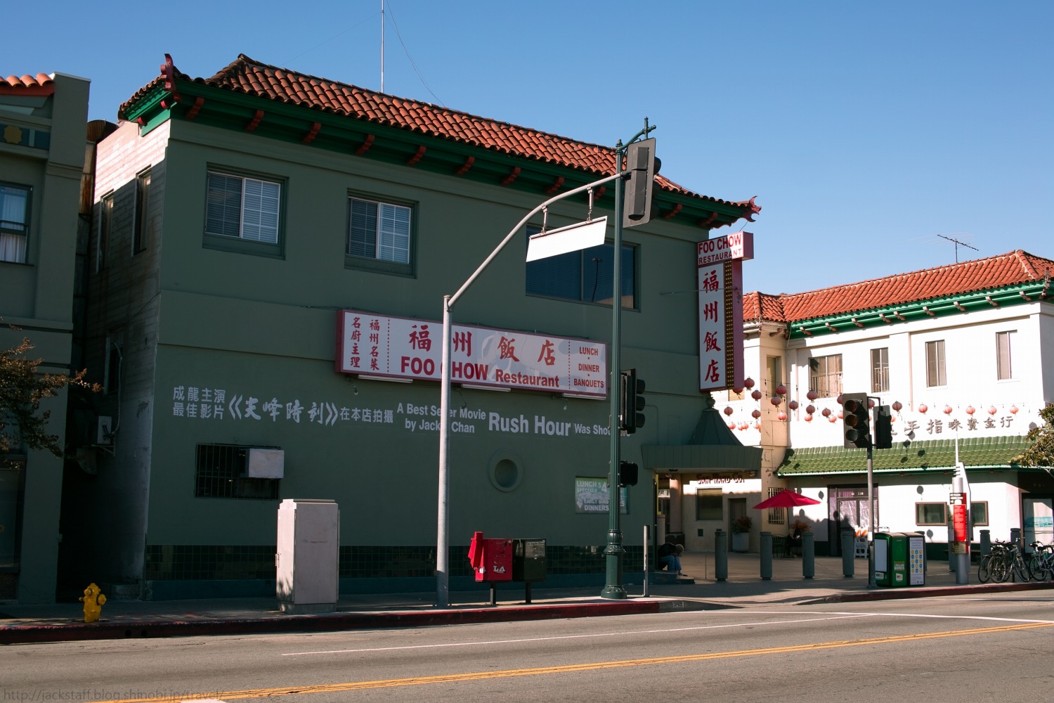 右:Chinatownの文字が掲げてある。 チャイナタウンは広い、さっきの日本村が何だったのかと思うくらいのスペースがある。まさに地図の縮図位のスケールの違いか。店の様子や食べ物なんかは横浜のそれと同じような感じだ。 ちなみに中華ばかり食べている印象を受けるかもしれないが、たまたま紹介する機会があっただけでバーガーもしっかり食べているから安心してほしい。 ここが目的地、フー・チョウ・レストラン、ジャッキー・チェンとクリス・タッカーのアクションコメディー、ラッシュアワーのロケ地だ。 この場所に関しての詳しい説明はまた「ロケ地巡りの回」で話すが、店内にはジャッキーの写真が飾られていたりもする。 量が多いかと思ったが二品くらいでちょうどいいよと店主が言うのでお勧めのチキンとエビチリとご飯を注文。 しばらくして料理が届いたがなんてことはない、物凄い大盛りだった。 チキンも甘辛いソースで、エビチリもプリッとしていて美味い。確かに美味い、がこれはなかなかの試練だった。 今思えば持ち帰り用のドギーバッグを貰えば良かったのだが、まだこの時点ではその術を知らなかった。 中国の文化として、料理は少し残した方が印象がいいと以前何かで読んだのを思い出し、それに習ったと見せかけての満腹でギブアップである。 さすがに食べ過ぎてしまったので気分転換もかねて少し歩いて周ろう。 LAでは珍しい電車、メトロレールが走ってきた。たぶんこれはゴールドラインだ。