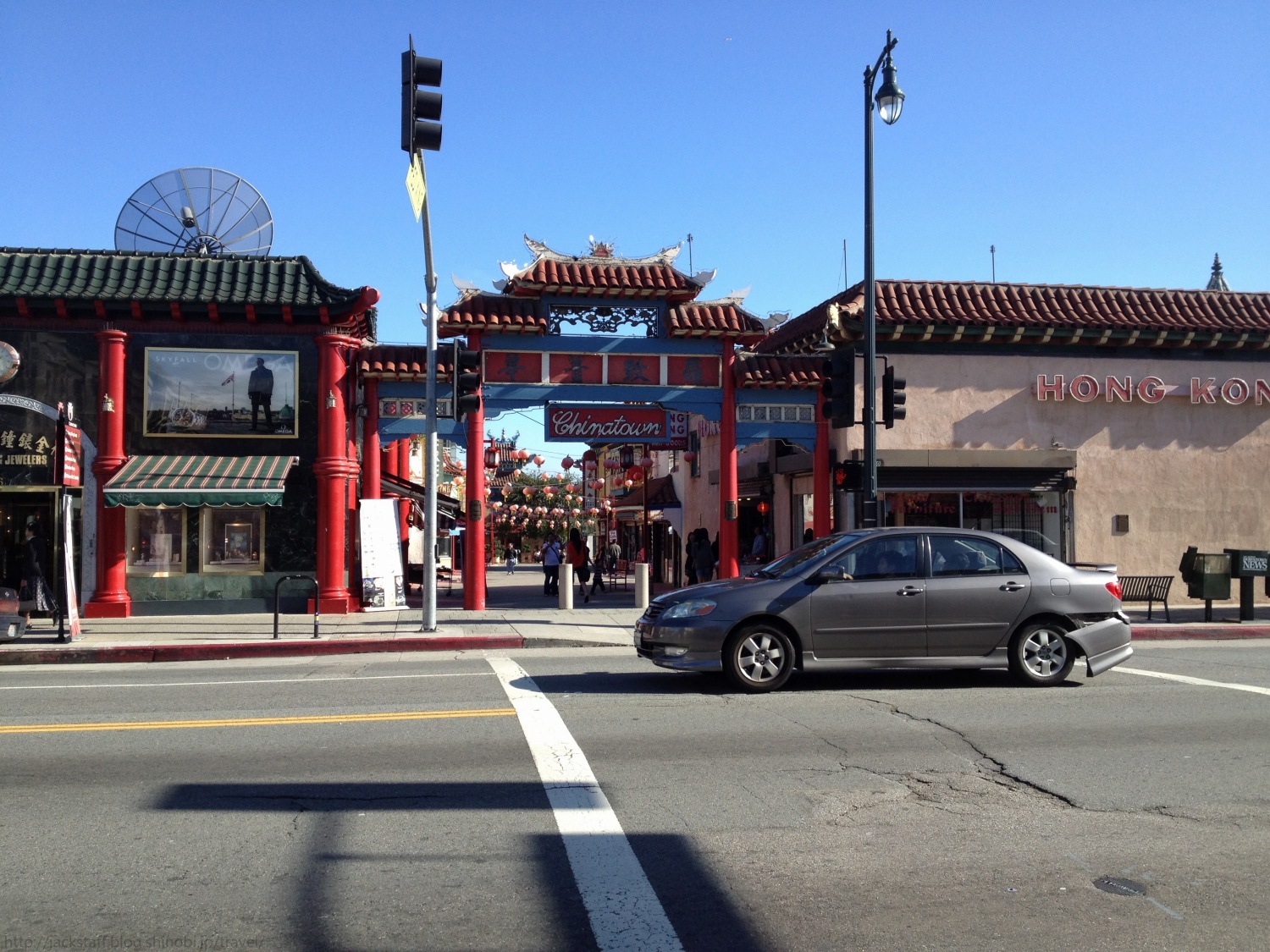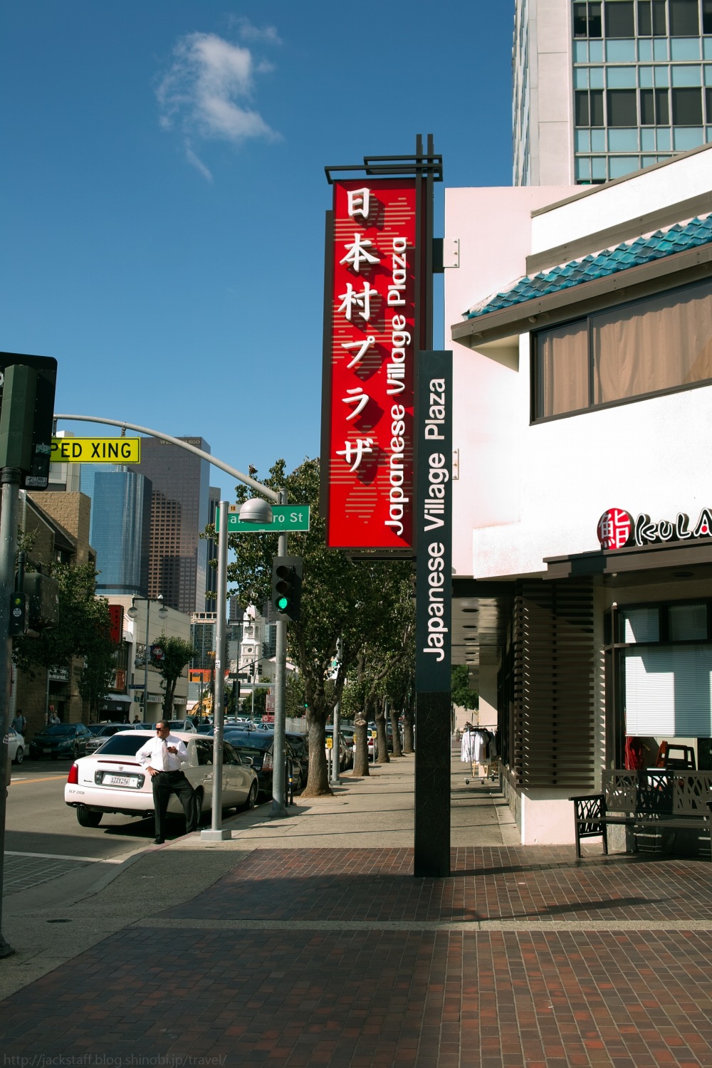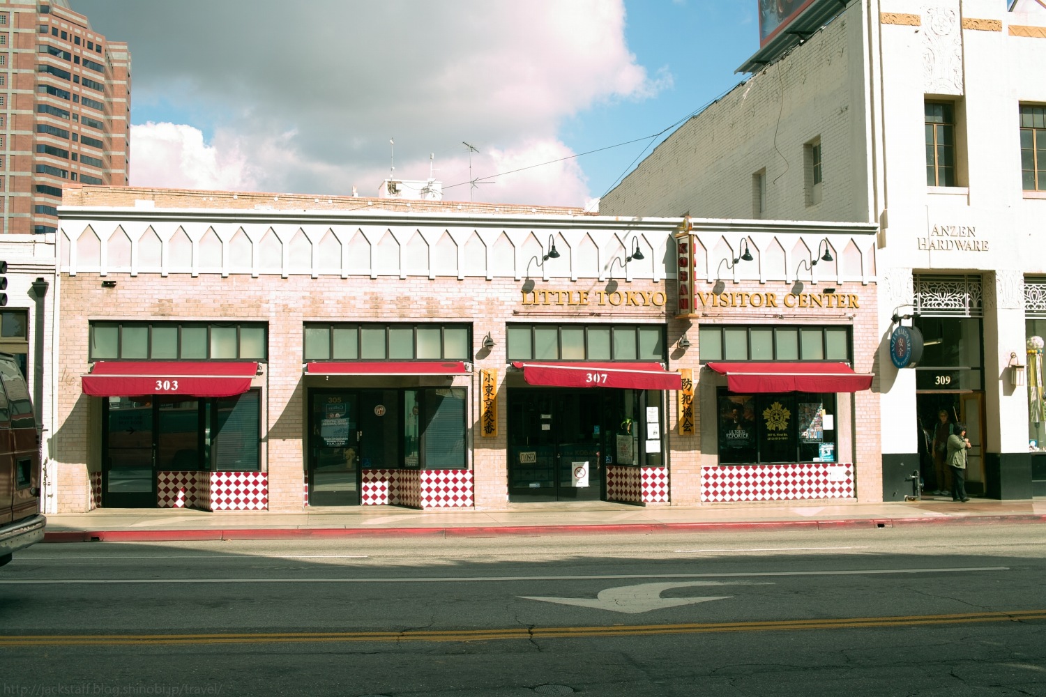 右:この様に両サイド一人ずつの白バイ警官だけで車止めがされていた。実にラフだ。 それにしても緩い。ローバジェットのドラマか映画だとは思うが高架橋の両入口に白バイの警察官が一人ずつだけで車止めをして真昼間の街中でカーチェイスの撮影をしているのだ。 やはり役所の協力があるのは強い。もちろん正規の手続きは踏んでいるだろうがこれだけラフに行えるなら街全体がセットのようなものだ。 東京でもこれだけ手軽にカーアクションが撮影出来たら、なんて幻想を抱きつつ先へ進む。 左:撮影を終えて帰っていく白バイ。 ダウンタウンで気になっていたのはリトル・トーキョー、日本人地域だ。 ダウンタウンの東側に位置しているアメリカ最大の日本人地域で、全米日系人博物館もここにある。ちなみにすぐ近くにあのスキッド・ロウがあるので迷い込まないように注意したい。 観光エリア、日本村プラザを歩く。日本食の飲食店や土産屋、日本らしい朱色の櫓や提灯の並ぶまさに小さな東京と呼べるような一角だ。しかし、以前の日本スーパーでもそうだがどうも変な気分になる。 せっかくなのでカルフォルニア・ロールを試してみようかと寿司屋のメニューを見たが、どうも気が乗らず他を探すことにしたが、長期滞在の場合には欠かせない存在となりそうな地域だ。 左:ビジターセンター、「小東京交番」「防犯協会」の日本語文字が面白い。