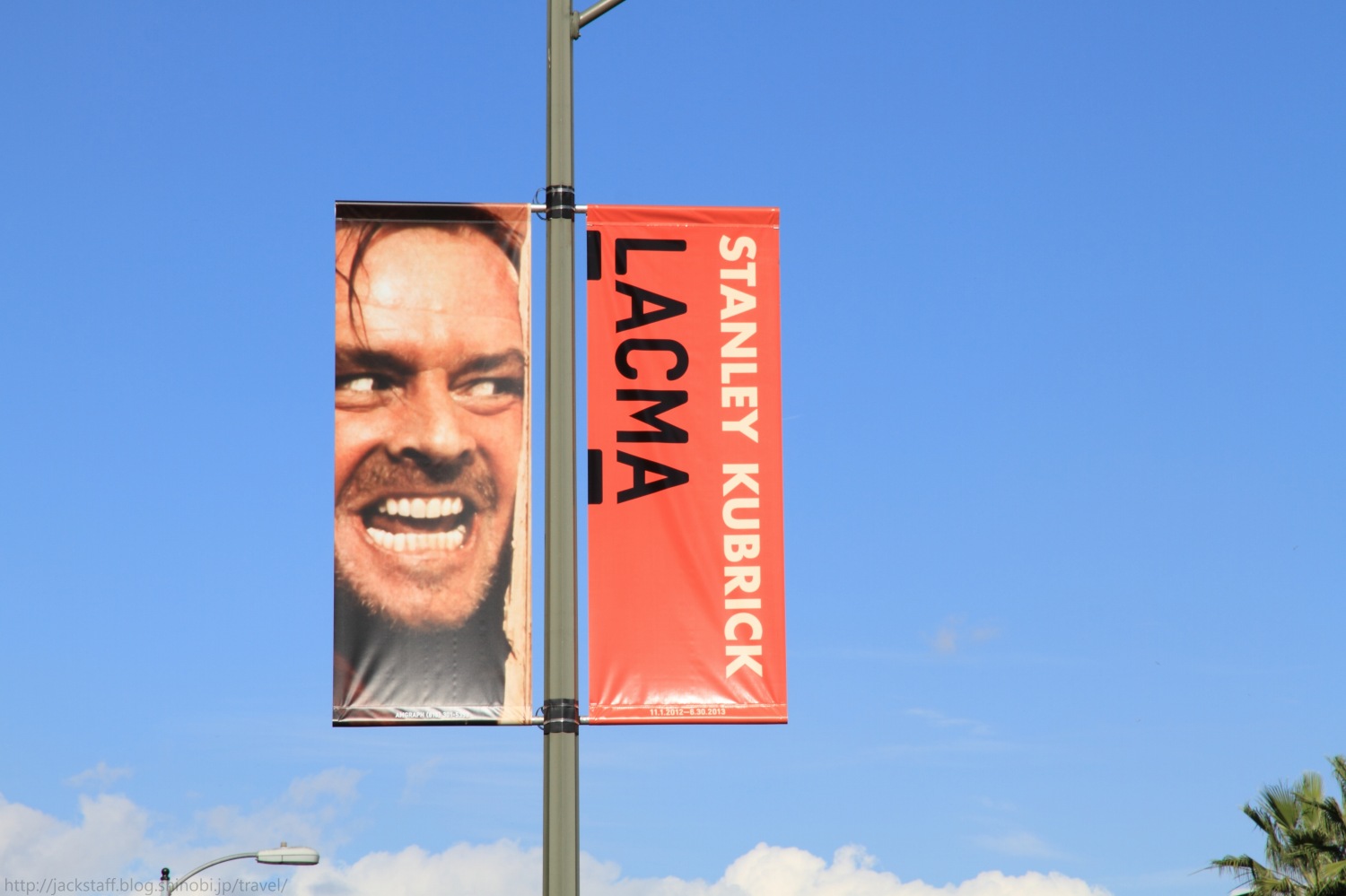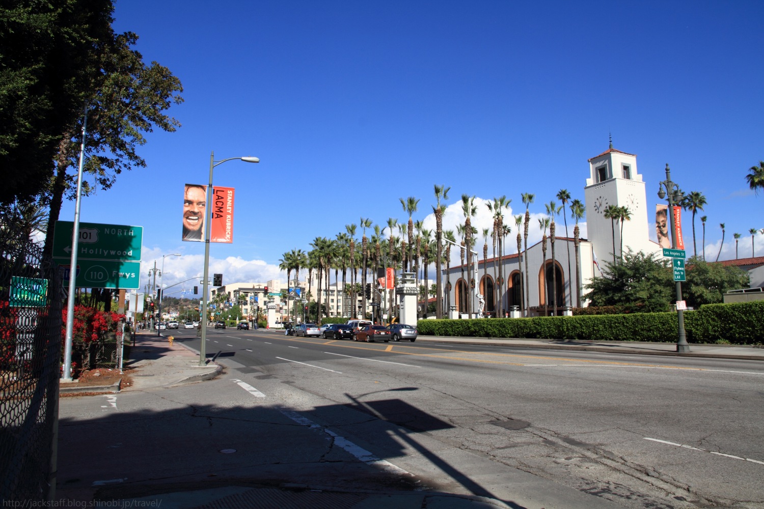 右:日本村プラザ内、提灯が並び祭りのようだ。写真にはあまり写っていないが多くの人で賑わっていた。 特に目的も無くアラメダ・ストリートを北へと歩くと不意にユニオン・ステーションの前に出た。中には入らなかったがここも美しい内装の駅だ。 ちょうどヤシの木の選定作業をしていたようで大きなクレーンのような物で豪快に切り落としていた。 左:LACMAのキューブリック展ポスターがウェンディーしている。