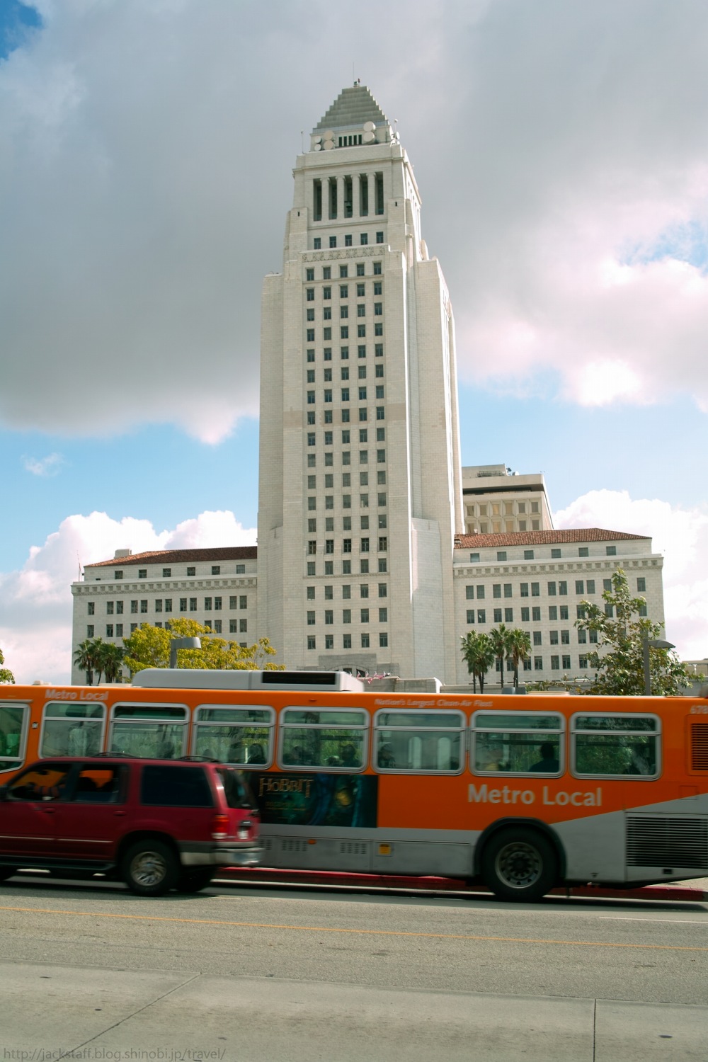 右:少し歩いたところに映画関係の仕事のポスターが出ていた。ビザさえあれば。。 左:ロサンゼルス市庁舎だ。無料展望台があるらしいが、今回はタイミングが合わなかった。