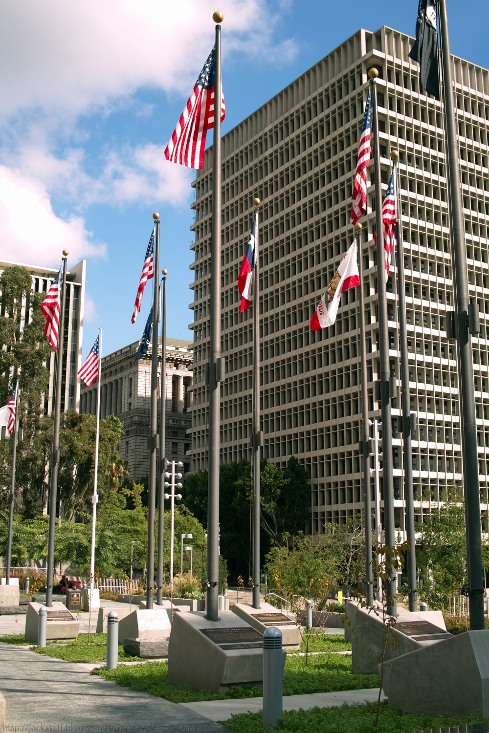 右:市庁舎横グランドパーク、103歳の老人により新しく作られた9/11への旗らしい。グランドパークはとても心地が良い場所だ。 Los Angeles City Hall(Grand Park隣接)