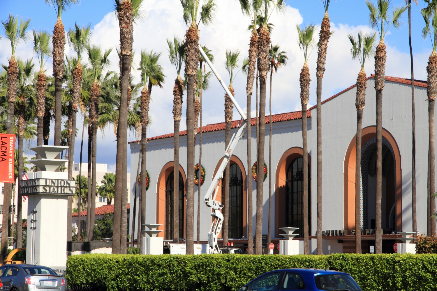 右:大きなクレーンでヤシの木の剪定作業が行われていた。 Union Station