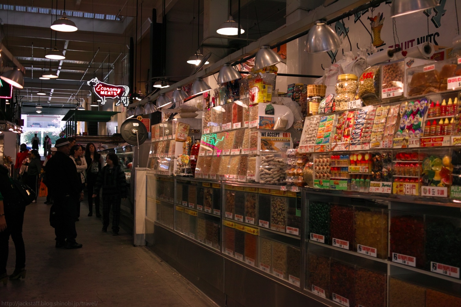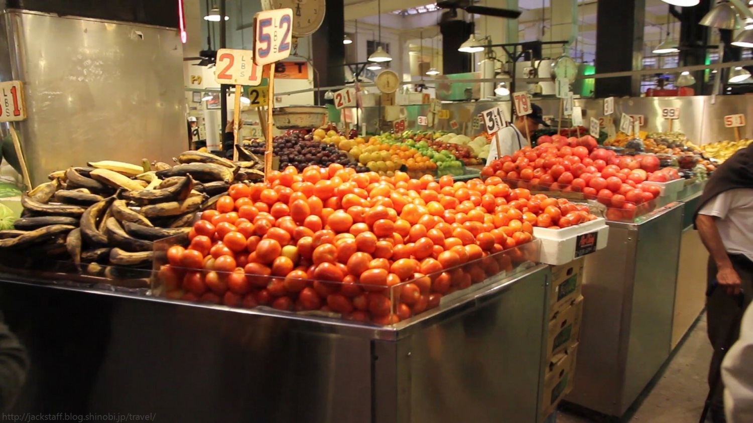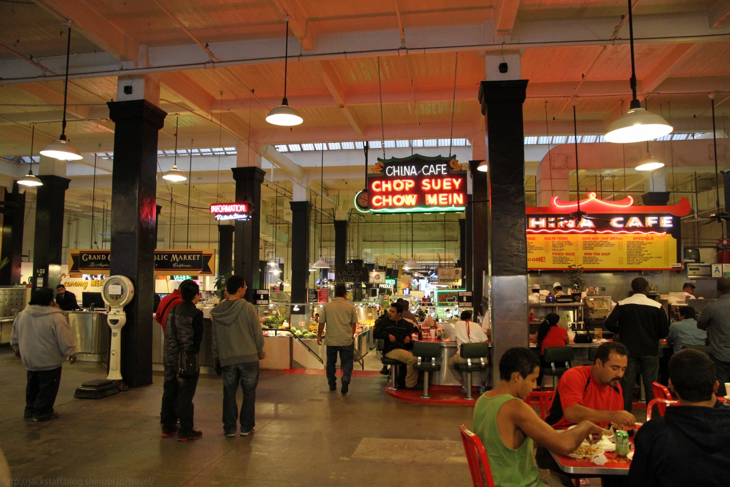 200 N Spring St, Los Angeles, CA 90012 http://grandparkla.org/(Grand Park) また当てもなく歩いていると面白そうな場所を発見した。グランド・セントラル・マーケット、ロサンゼルスの台所だ。ガイドブックで目にして行って見たいと思っていたところだったのだが、まさか偶然たどり着くとは思わなかった。 色とりどりのフルーツや海鮮類、肉類などが店先に並んでいる。見たこともないフルーツも多く並んでいて満腹で無ければ買ってみたかった。 左:飲食店も多く、マーケット内で食事も出来る。