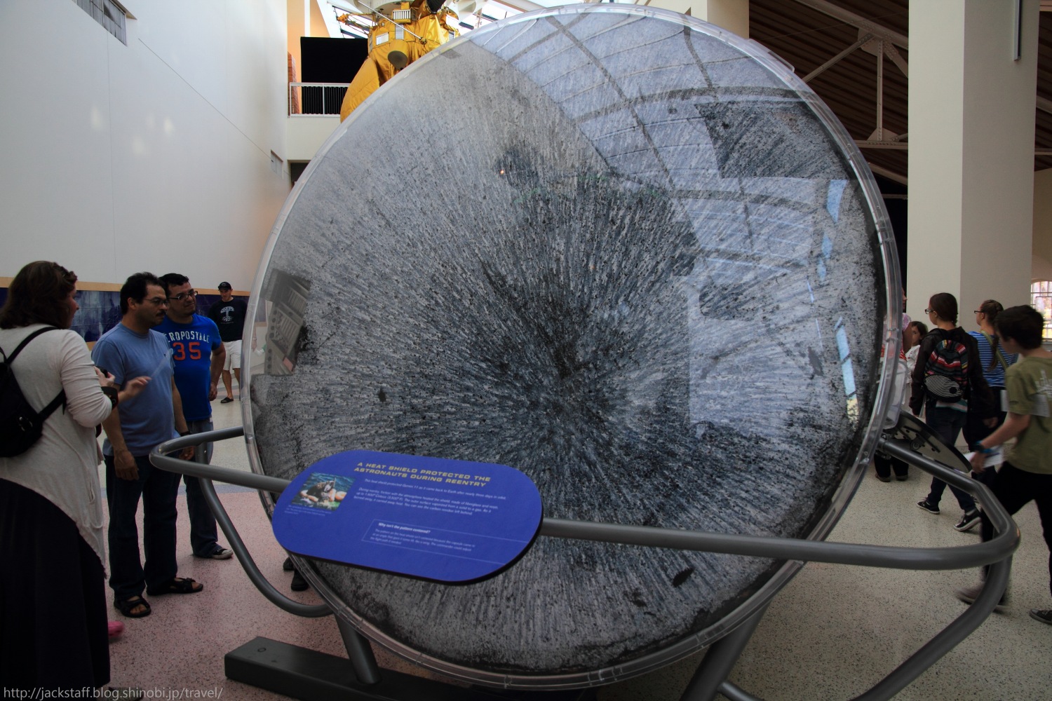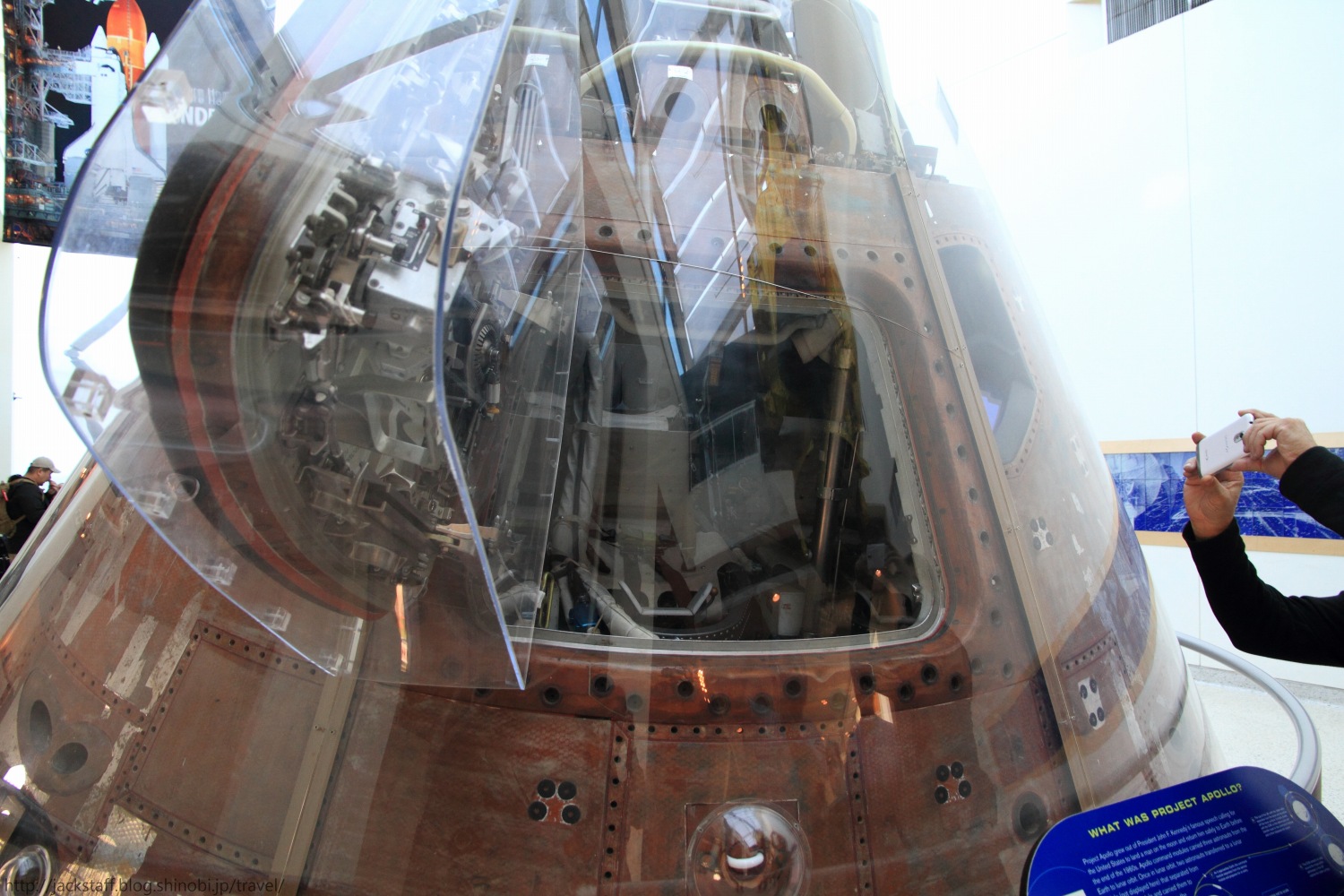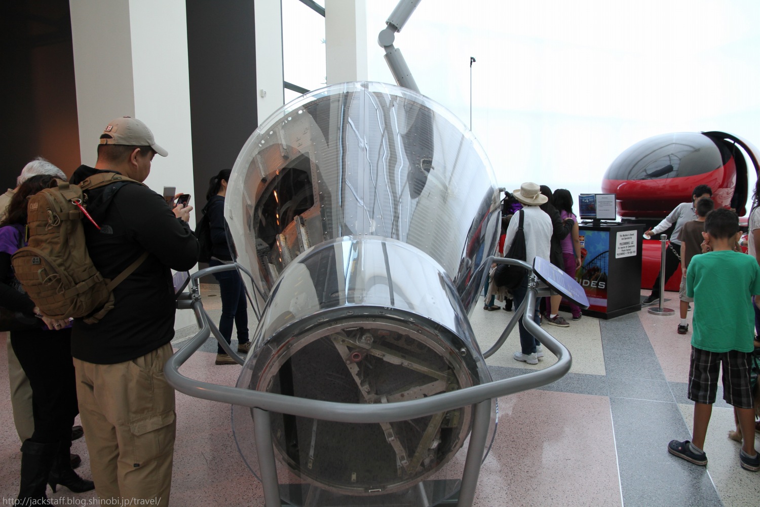 右:中へ入る。空中にはF-20(左側)とT-38(右側)、インパクトがある。 ゲートを潜るといきなり空中にF-20とT-38が展示してあるのが目に入る。前者は試作機のみ、後者は訓練機、なるほど分かってきた。ここカリフォルニア科学センターは教育を目的とした機関、先ほどのA-12が訓練機だったのもそうだが、航空機として展示しているわけで決して兵器である戦闘機として置いているのではないのだろう。そこに何か誇りのような物を感じた。 そう、ここカリフォルニア科学センターは教育に重きを置いた場所で、なんと入場料は無料なのだ。平日ではあったが中は子供連れの家族客で賑わっていた。こういった手軽に科学と触れ合える施設があるのは本当に素晴らしいことだと思う。しかも展示品の多くには体験コーナーがあり、実際に触って原理や仕組みを理解することができる。教育機関としても本当に良い場所だ。 まずはエンデバーを見ようと列に並んだのだが、どうも前の家族がチケットがどうこう話をしている。もしかすると整理券が必要なのかとそのカウボーイ風お父さんに聞いてみたところ、どうやら入口横の窓口でチケットを買ってこないといけないらしい。なんとも丁寧に教えてくれた良いお父さんだった。 チケットはIMAXとのセットもあったが時間の都合上エンデバーだけのものを購入、しかもたった2ドルなのだから驚きだ。 入場の整理番号までまだ時間があったので先に館内を見て周ろう。 1960年代ジョン・F・ケネディー大統領の元で本格的に始動したアポロ計画、まさに冷戦下でのソビエト連邦との開発競争真っ只中であった。時は流れ1975年、アポロ・ソユーズテスト計画、これはそのミッションで実際に使用された司令船だ。この二国の宇宙船のドッキングはつまり宇宙開発競争の終わりを意味し、またアポロによる最後の有人宇宙飛行でもあった。