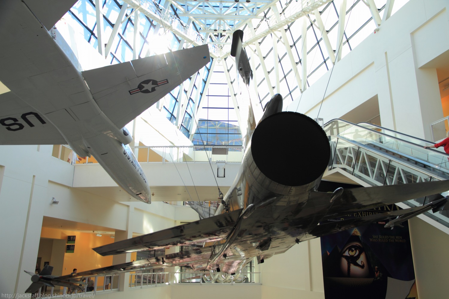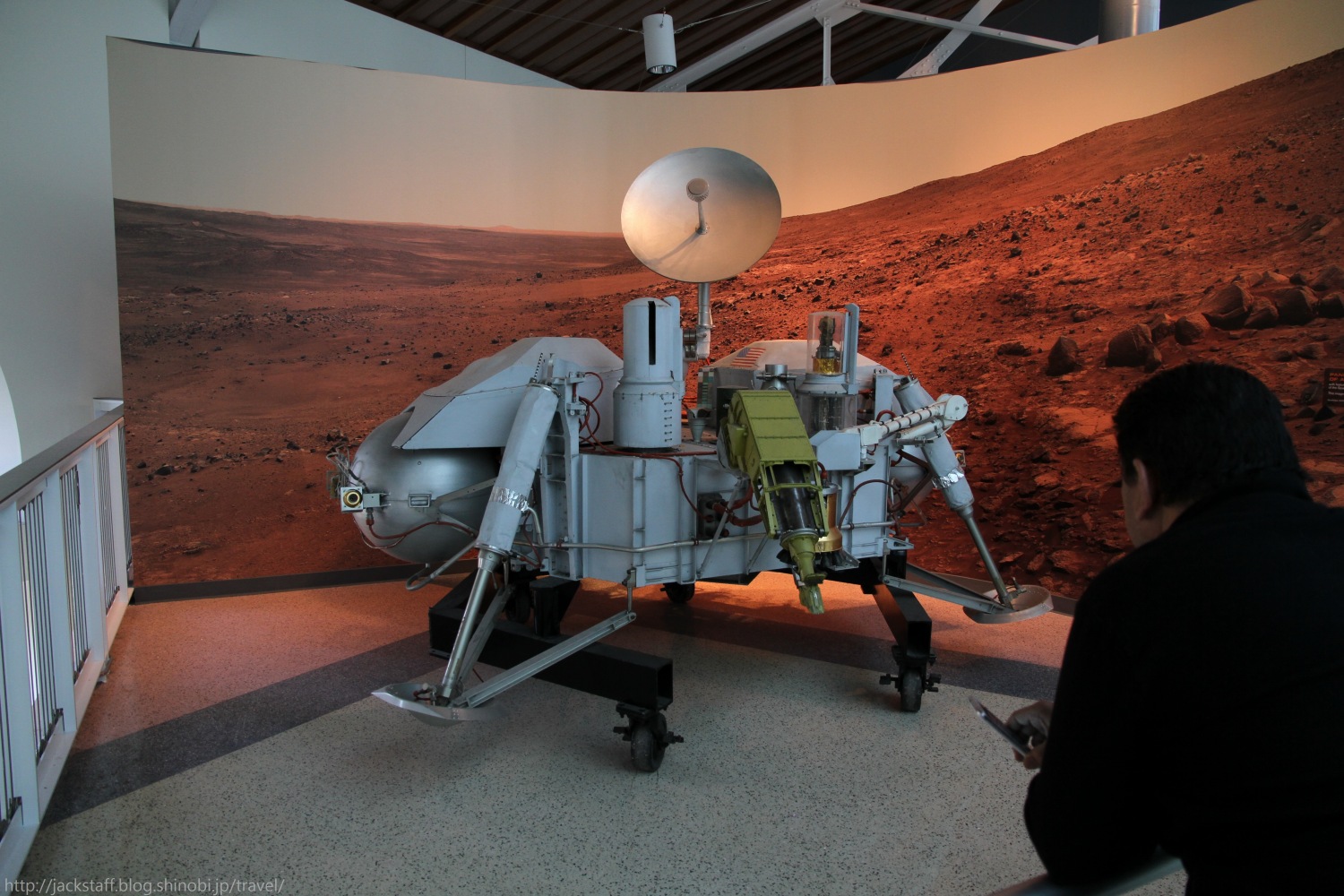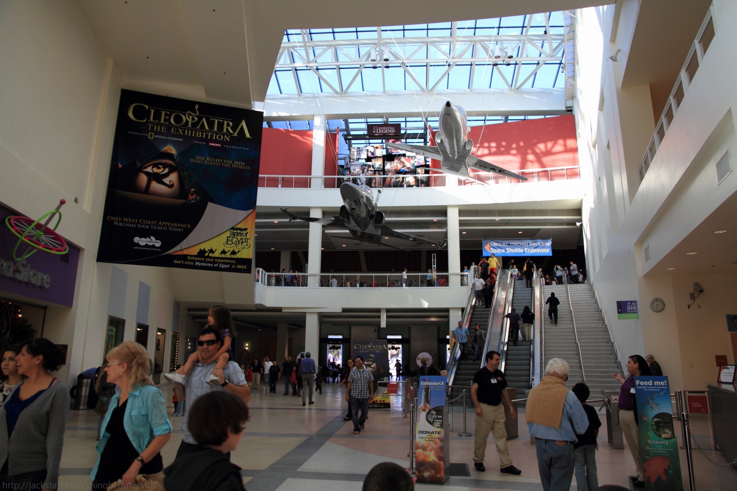 右:中へ入る。空中にはF-20(左側)とT-38(右側)、インパクトがある。 ゲートを潜るといきなり空中にF-20とT-38が展示してあるのが目に入る。前者は試作機のみ、後者は訓練機、なるほど分かってきた。ここカリフォルニア科学センターは教育を目的とした機関、先ほどのA-12が訓練機だったのもそうだが、航空機として展示しているわけで決して兵器である戦闘機として置いているのではないのだろう。そこに何か誇りのような物を感じた。 そう、ここカリフォルニア科学センターは教育に重きを置いた場所で、なんと入場料は無料なのだ。平日ではあったが中は子供連れの家族客で賑わっていた。こういった手軽に科学と触れ合える施設があるのは本当に素晴らしいことだと思う。しかも展示品の多くには体験コーナーがあり、実際に触って原理や仕組みを理解することができる。教育機関としても本当に良い場所だ。 まずはエンデバーを見ようと列に並んだのだが、どうも前の家族がチケットがどうこう話をしている。もしかすると整理券が必要なのかとそのカウボーイ風お父さんに聞いてみたところ、どうやら入口横の窓口でチケットを買ってこないといけないらしい。なんとも丁寧に教えてくれた良いお父さんだった。 チケットはIMAXとのセットもあったが時間の都合上エンデバーだけのものを購入、しかもたった2ドルなのだから驚きだ。 入場の整理番号までまだ時間があったので先に館内を見て周ろう。 1960年代ジョン・F・ケネディー大統領の元で本格的に始動したアポロ計画、まさに冷戦下でのソビエト連邦との開発競争真っ只中であった。時は流れ1975年、アポロ・ソユーズテスト計画、これはそのミッションで実際に使用された司令船だ。この二国の宇宙船のドッキングはつまり宇宙開発競争の終わりを意味し、またアポロによる最後の有人宇宙飛行でもあった。