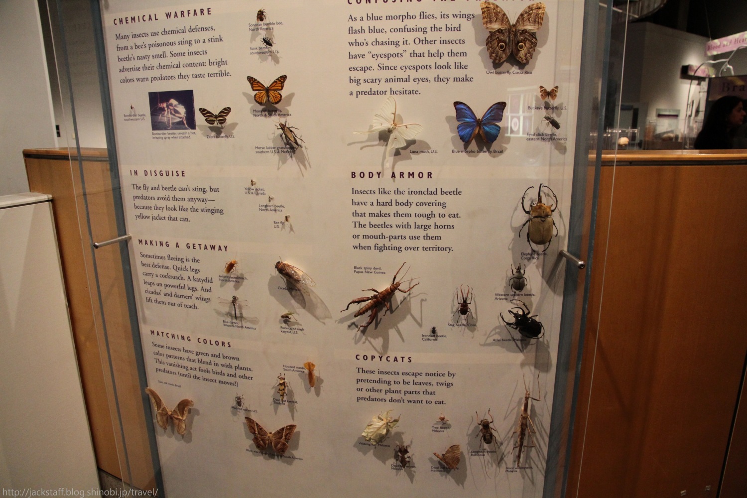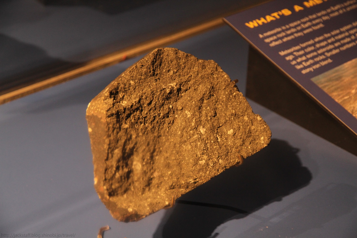 右:メキシコで発見された炭素質コンドライトの石質隕石だ。暗く、すすけた、炭素が豊富な小惑星から来たらしい。 左:(昆虫画像)ここには航空機や宇宙関係の物だけではなく、あらゆる生物に関する展示、人体に関する展示なども豊富にある。