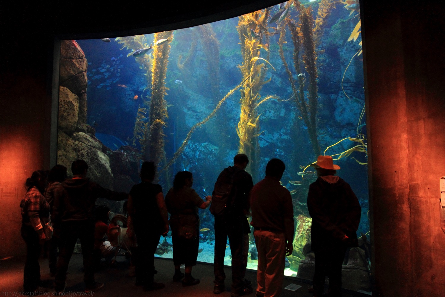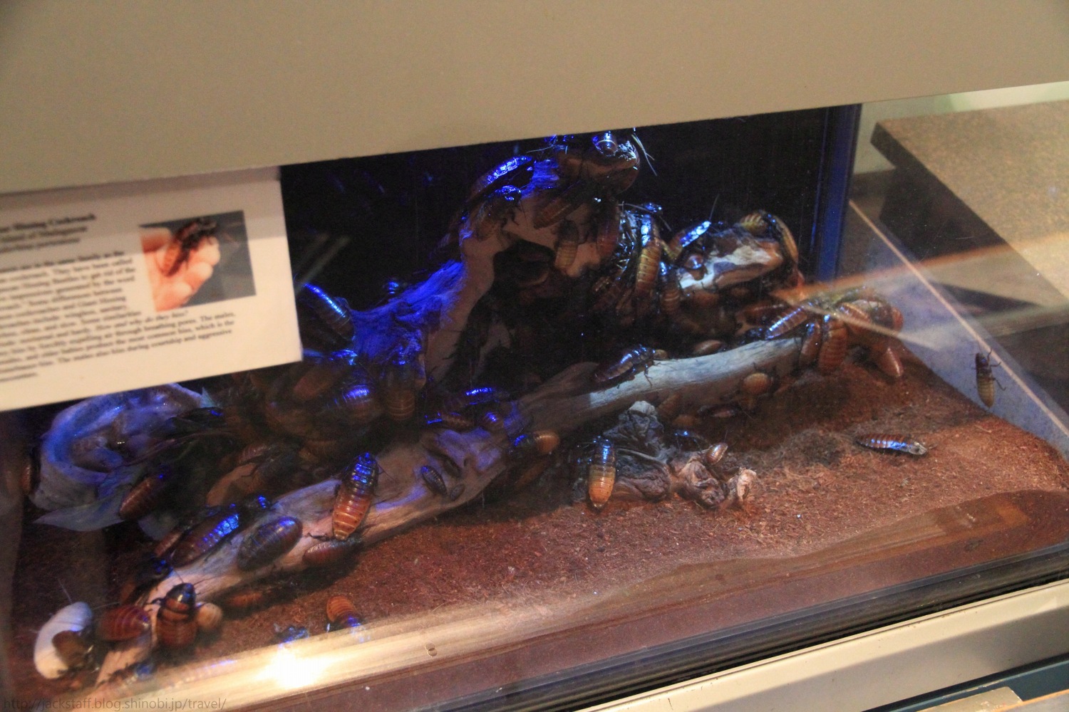 右:(昆虫画像)こいつらはHissing Cockroach、マダガスカルゴキブリと呼ばれるペットなんかにもされる大型のゴキブリだ。ゆっくり動いていてよく見るとなかなか愛嬌がある。隣にいた女の子と見入るようにじっと観察していたがこれは飽きない。 左:吹き抜けの水槽が広がり、本物の陽が差し込む自然の環境が再現されている。