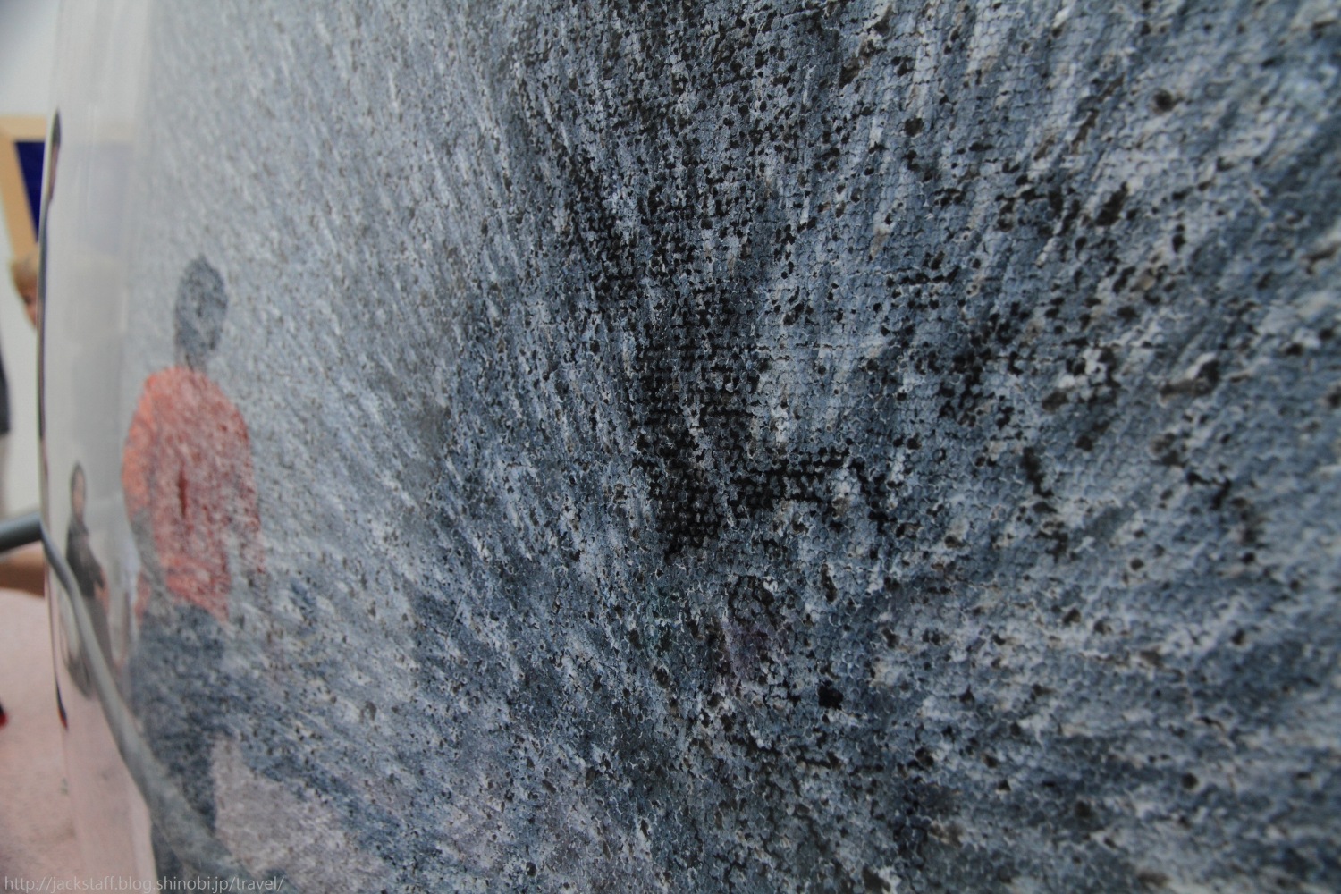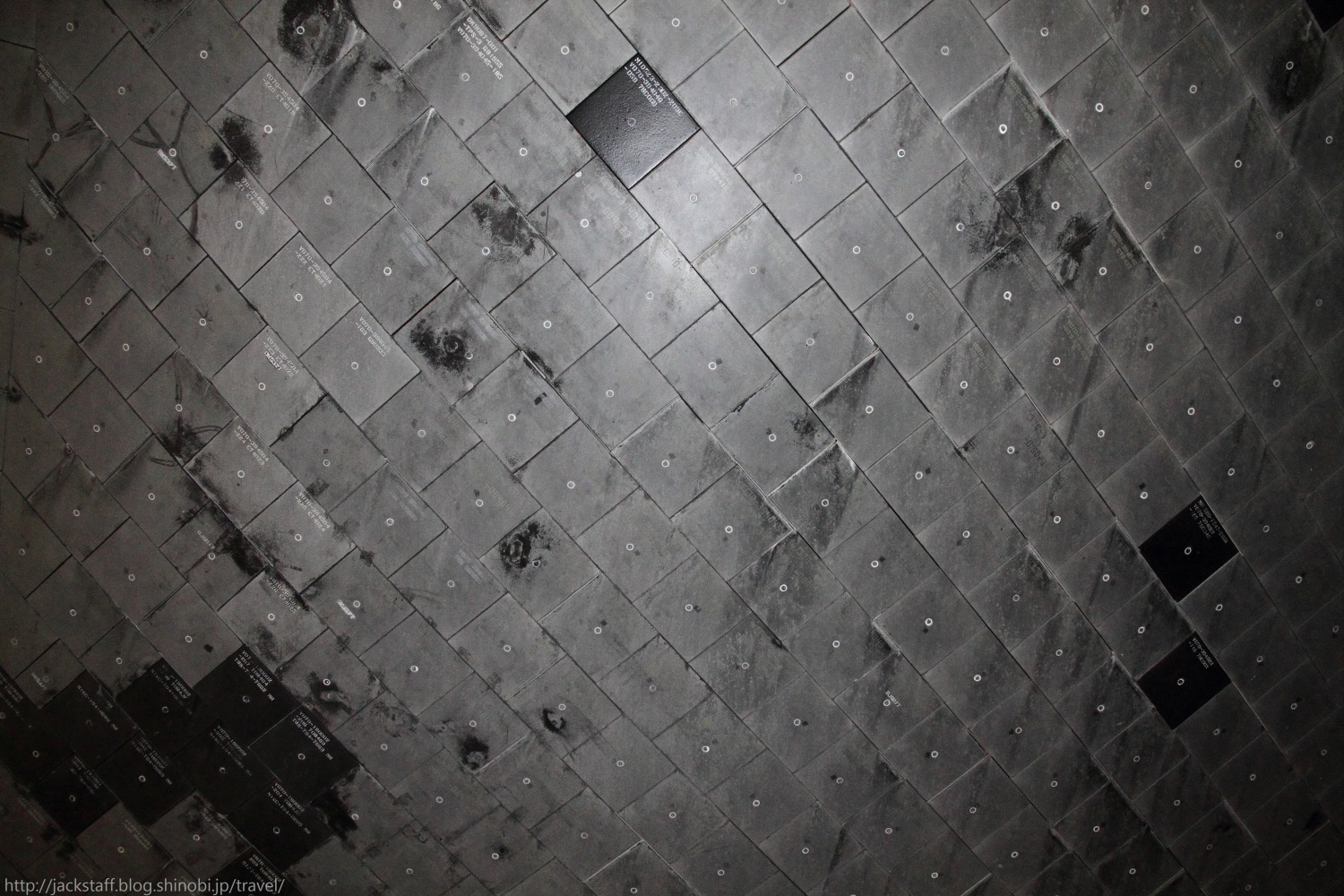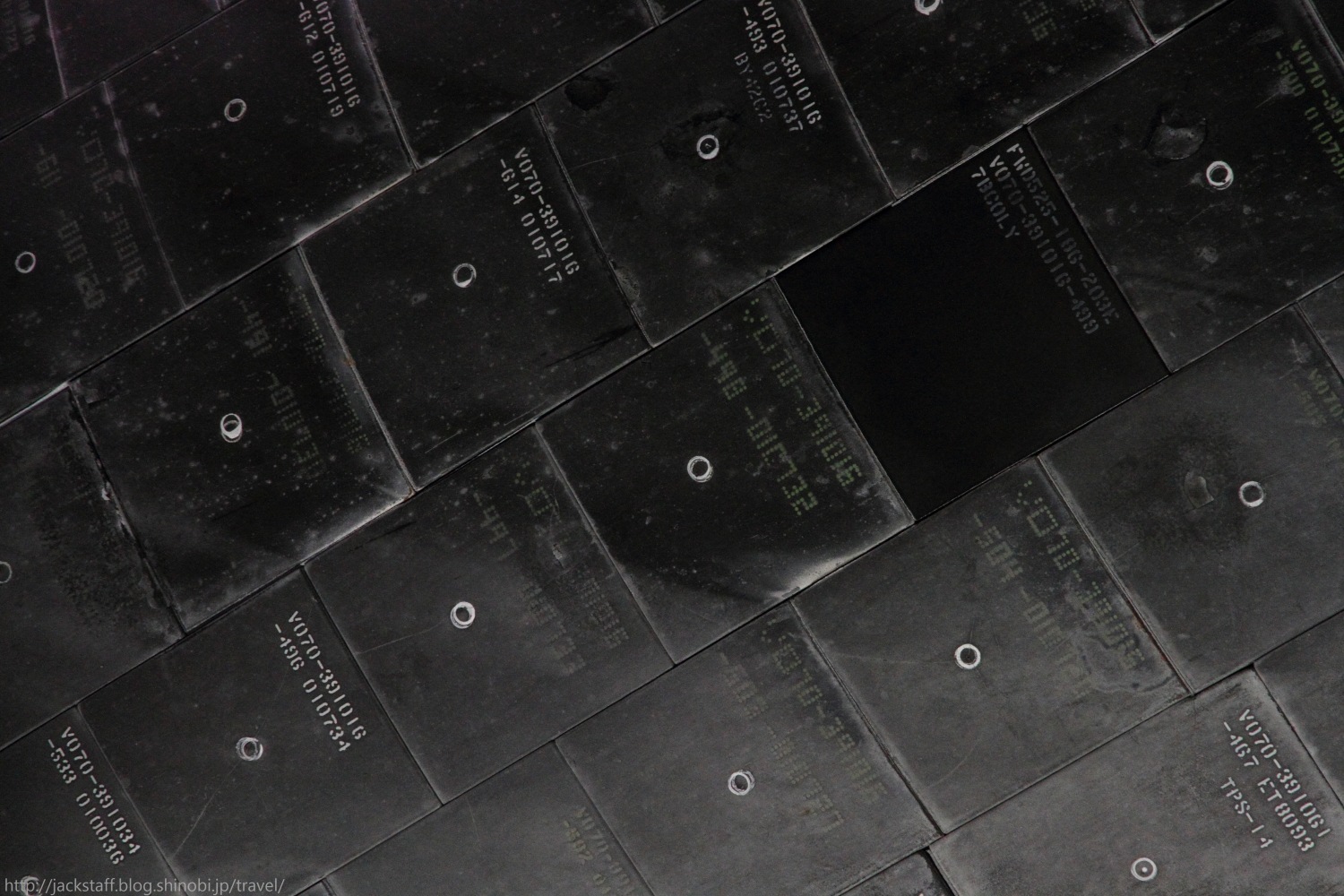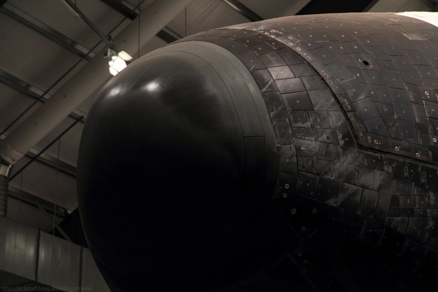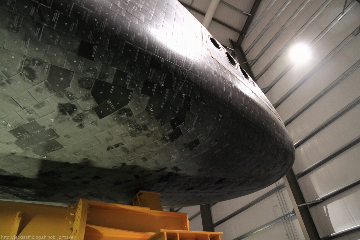 その周りをぐるりと回れたり、この状態では難しい上面や、コックピットの近くを見学することも出来そうだ。完成は2017年を予定しているらしいがこれは楽しみだ。縦置きを間近で見学出来る迫力は凄まじいに違いない。 逆に、エンデバーの土手っ腹に潜り込むことが出来るのは恐らく今の展示の時だけだろう。耐熱タイルの様子を詳細に見たい人は変わってしまう前に一度見に行くべきだ。その価値は十分にある。 大気圏再突入時、機体表面は1600℃以上にもなる、その過酷な状況で機体を守るのがこの耐熱タイルだ。LI-900と言う素材で作られた耐熱タイルは真っ赤になるまで熱せられても素手で持つことが出来るほど熱が伝わらない。
