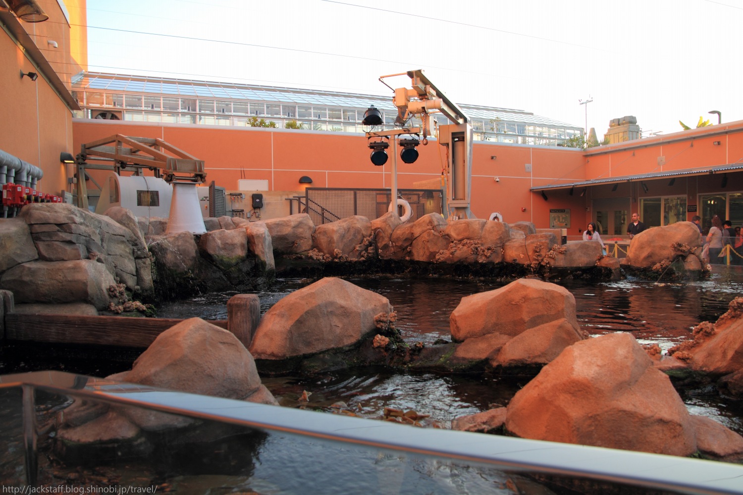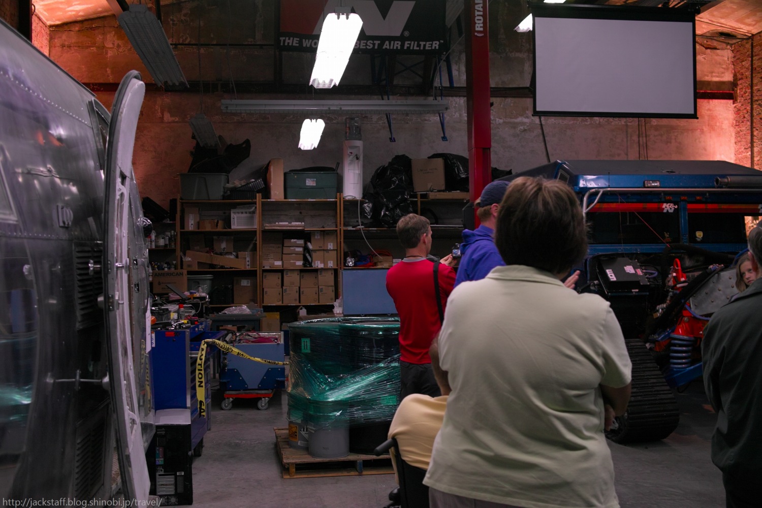 右:水槽外、左奥の白い装置が上下することによって波を発生させている。 「STSってのはこんなので、Endeavourはこんな機体でこんな偉業を成し遂げていて日本人も初めて乗ったよblah blah blah、彼女の旅はカリフォルニアのここから始まるよ!」みたいな感じのイントロダクション。