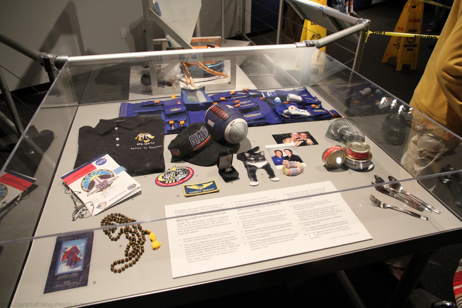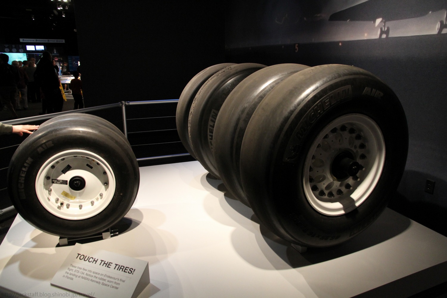 そろそろ入場開始の時間だ。先ほどのエントランスへと向かい、特設会場へ入った。 まず最初に見えてきたのが実物サイズのタイヤや管制室、宇宙空間で使われるトイレの浄水器やクルーが持参した私物の例、そしてエンデバーの歴史とカリフォルニア科学センターへとやってくるまでの軌跡が語られていた。 左:一般的な航空機よりも重く着陸も特殊なオービタを支えるのはこの強靭なタイヤだ。オービタの着陸時のタイヤへの負荷はジャンボジェットとして知られるB747の3~4倍だと言われている。これはエンデバー最終任務STS-134で実際に使われたもの、ご覧のように実際にタイヤに触れてみることが出来る。