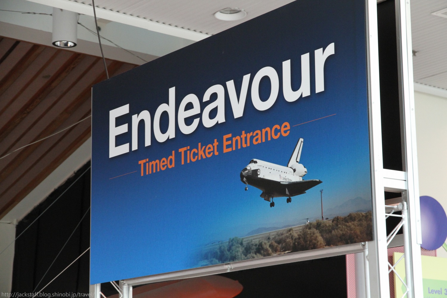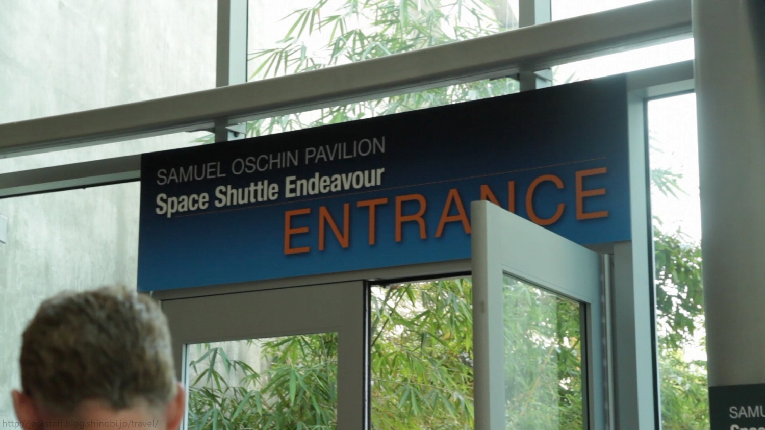右:NASAの宇宙飛行士Garrett Reismanが宇宙へ持っていった私物。右中央の缶はISSでロシアから供給された宇宙食らしい、ギャレットはPike Perch Pilafが好物だったと書かれている。Yum! さらに進む。 順路通りに進んで行くと途中、プラスチックのコイン型トークンを渡される。これは次のゲートをくぐる時のチケット代りとなるようだ。 焦れったいくらいに前振りが長いがその分期待値がどんどん上がって行く。楽しみだ。 これもまた見事なショートフィルムだ、拍手を送り次に進む。黒のコイントークンを渡し、代わりに紫のトークンを受け取る。どうやら一度外へ出てそこから展示室へと向かうらしい。屋外の大きな格納庫がガラス越しに見えてきた。エンデバーはあの中にある。 カリフォルニアの晴天の中からでは、小さい扉から覗く薄暗い室内はよく見えない。期待に胸高鳴らせながら列に並び、ゆっくりと格納庫の扉をくぐった。 扉のサイズからは想像もつかないほど大きく広がる格納庫の中心に、それ以上の存在感を漂わせてスペースシャトル エンデバーが展示してあった。 その機体は予想していたよりも大きく、地球と宇宙を往復した歴戦の証と共に、誰もが一度は夢見た宇宙飛行士になりたいという幼き日のあの頃を思い出させ、無意識に感嘆の声をもらしていた。恐らく皆同じ気持ちを感じていたのだろう、誰よりもはしゃいでいたのはお父さん達だった。 僕の後ろにいた父に肩車をされた少年が入った瞬間思わず"Huge!"と叫んだ。しかしこれだけ大きな機体でも宇宙に出てしまえば光る「点」の一つでしかないのだ。 ちなみに現在の展示方法は仮のもので、最終的には縦置きの発射スタイルで展示されるらしい。