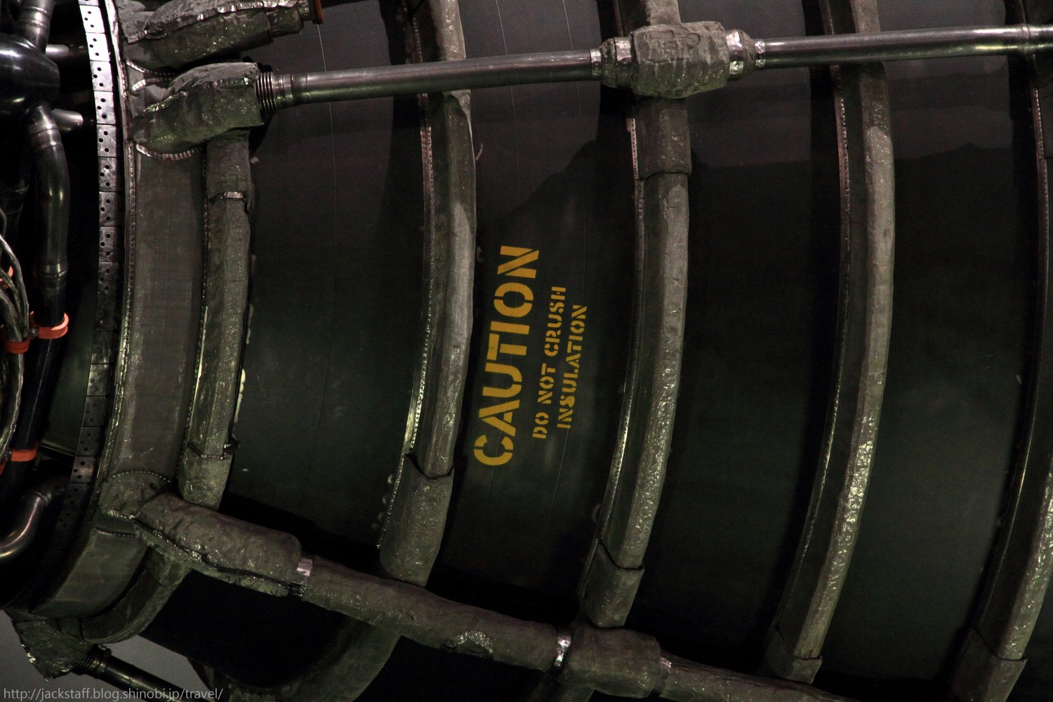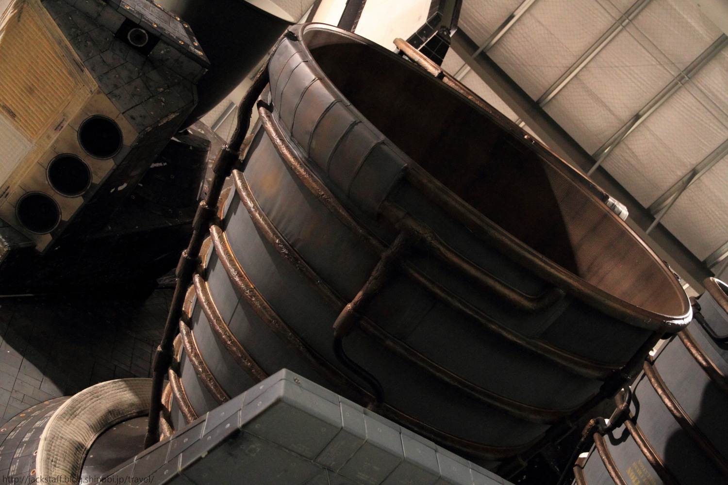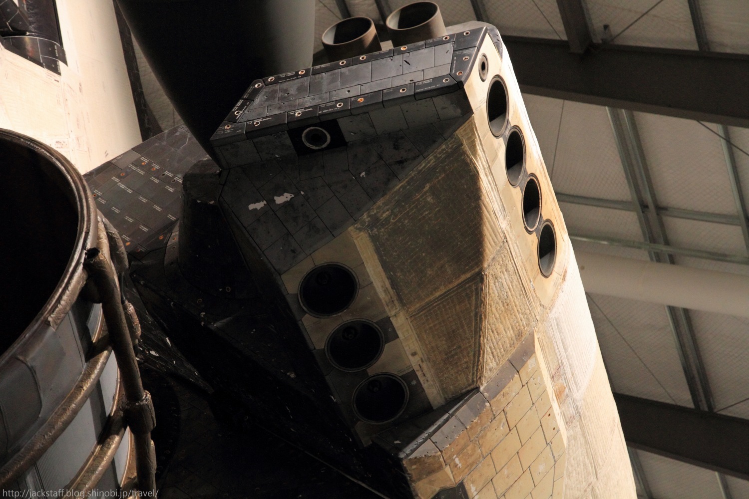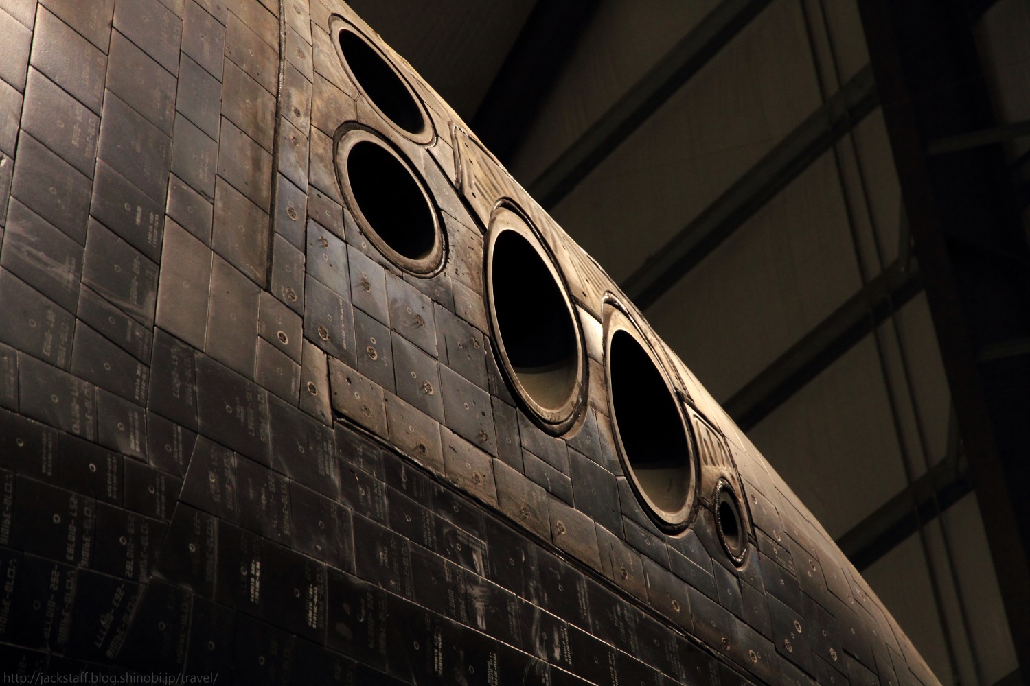 拡大すると分かりやすいがやはりエンジン周りは損傷が激しい、その細かな傷が宇宙からの帰還を物語っている。 これがそのSSMEの全貌だ。近くで見るとその巨大さと対照的な緻密さに驚かされる。このSSME3機から放たれるエネルギーはフーバーダム13個分の出力に匹敵するらしい、がスケールが大きすぎてさっぱり想像出来ない。