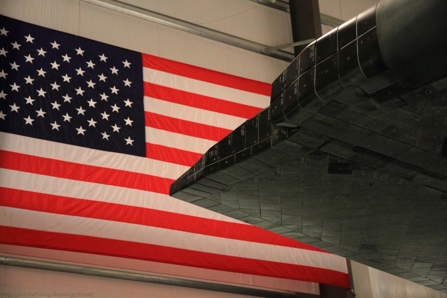 本館へ向かう途中、あの怪鳥SR-71ブラックバードの原型、A-12が出迎えてくれる。これは十数機作られたA-12の中の唯一の複座型練習機だ。この特徴的なフォルムはステルス性を高め、高高度、超高速飛行での偵察任務を目的とするために設計されたものだが、60年代にこれだけ斬新なデザインの機体が作られたと言うことに改めて驚きを感じる。 雨ざらしだがカリフォルニアの天候のためか保存状態は良い。それにしてもこっちの博物館はジオラマ等で当時を再現したものが多く、この機体にしても現役だった頃の躍動感を思わせる飛行姿勢での展示など流石に上手い。 そろそろ中に入ろう。 左:センターの壁面には大きくエンデバーが張り出されている。