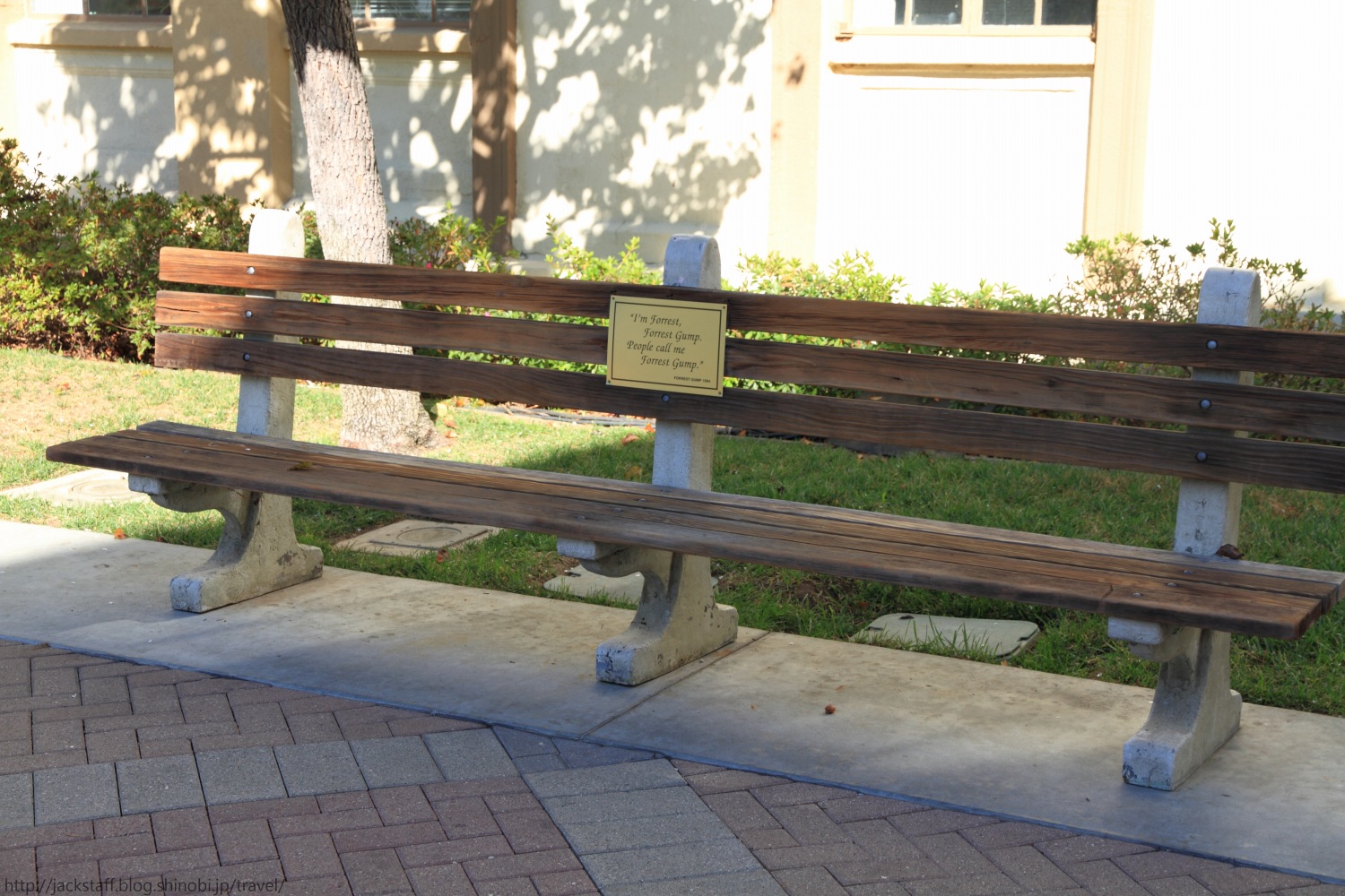 さぁいよいよ出発だ。 本場ハリウッドのスタジオはとにかく広い。その主要箇所を回って行くため、7人乗りのゴルフカートのような見た目のツアー・カーを使う。 一人客の男性がちゃっちゃと助手席に乗ってしまったので家族客に配慮し僕が最後尾後ろ向きに付けられた特別シートに乗ることになった。「その席は見晴らしが良くて僕も好きなんだ」とガイドが言っていたがまぁ外れ席だろう。ただ見晴らしは本当によかったので乗り物酔いしない人にはお勧めかもしれない。 左:これは「フォレスト・ガンプ」で実際に使われたベンチだ。Bubba Gump Shrimpでちょくちょく座っていたもののオリジナルになるわけだ。実際にあのポスターのように座って写真を撮ってもらったがあまりにも似ていなかった(座り方をちゃんと覚えていなかった)ので今回は自粛しよう。