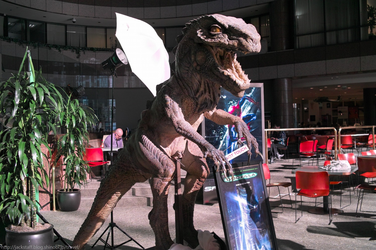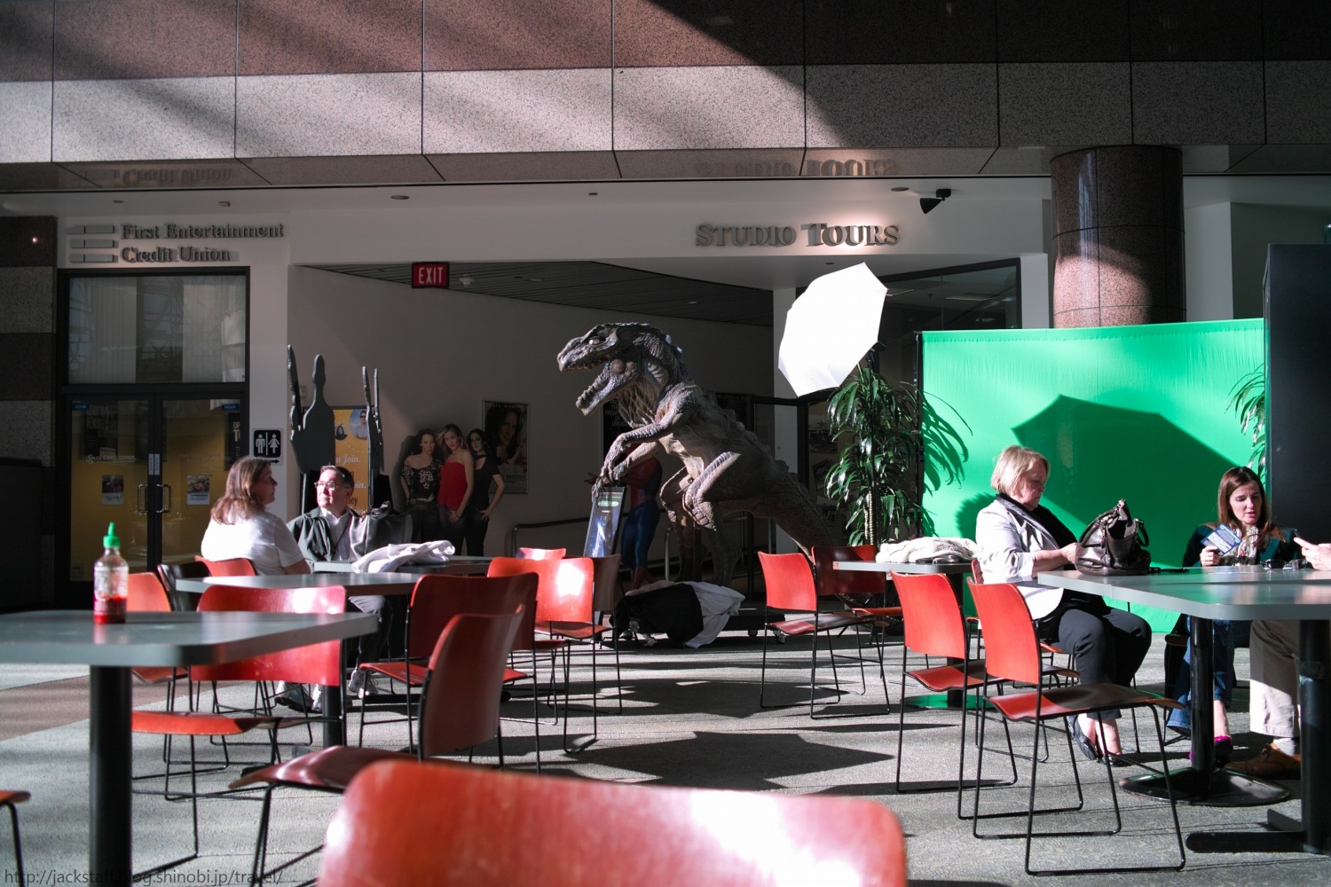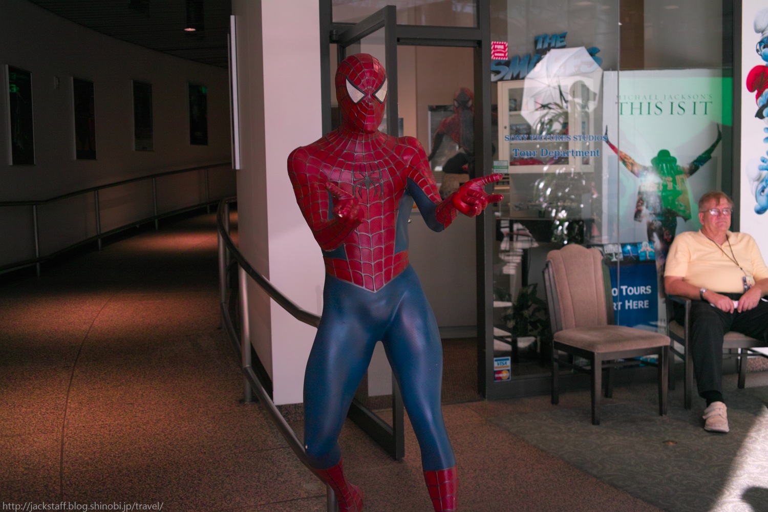 ソニー・ピクチャーズのスタジオ・ツアーの集合場所はカルバーシティにあるソニー・ピクチャーズ・プラザになっている。そこからスタートして隣接しているスタジオへと向かうのだ。ちなみにツアーゲストはプラザの地下駐車場を無料で利用することが出来る。ここも巨大なスタジオだが、プラザは新しいのか斬新なデザインをしている。ちなみに旧コロンビア・ピクチャーズのスタジオだ。 ツアー開始までしばらく時間があったのでプラザ一階カフェスペースでランチを取ることにする。社員証があると割引になるようだが一般客も食事が出来る。Wolfgang Puckという店のサンドイッチが美味しそうだったためそれを食べることにしたが、独自の選択式があまりよく分からず隣の女性に助けてもらいながら注文した。 普通のお姉さんに見えたが彼女もまた映画製作に携わるプロフェッショナルに違いない。 カフェスペースの周りにはUSA版ゴジラやスパイダーマン、MIBのハリボテなど有名キャラクターが多数展示してある。他にも空中にアパッチがぶら下げてあったりなど遊び心満載で非常に楽しい。 左:スパイダーマンだ、可愛い。右側の部屋がスタジオ・ツアーの事務所だ。