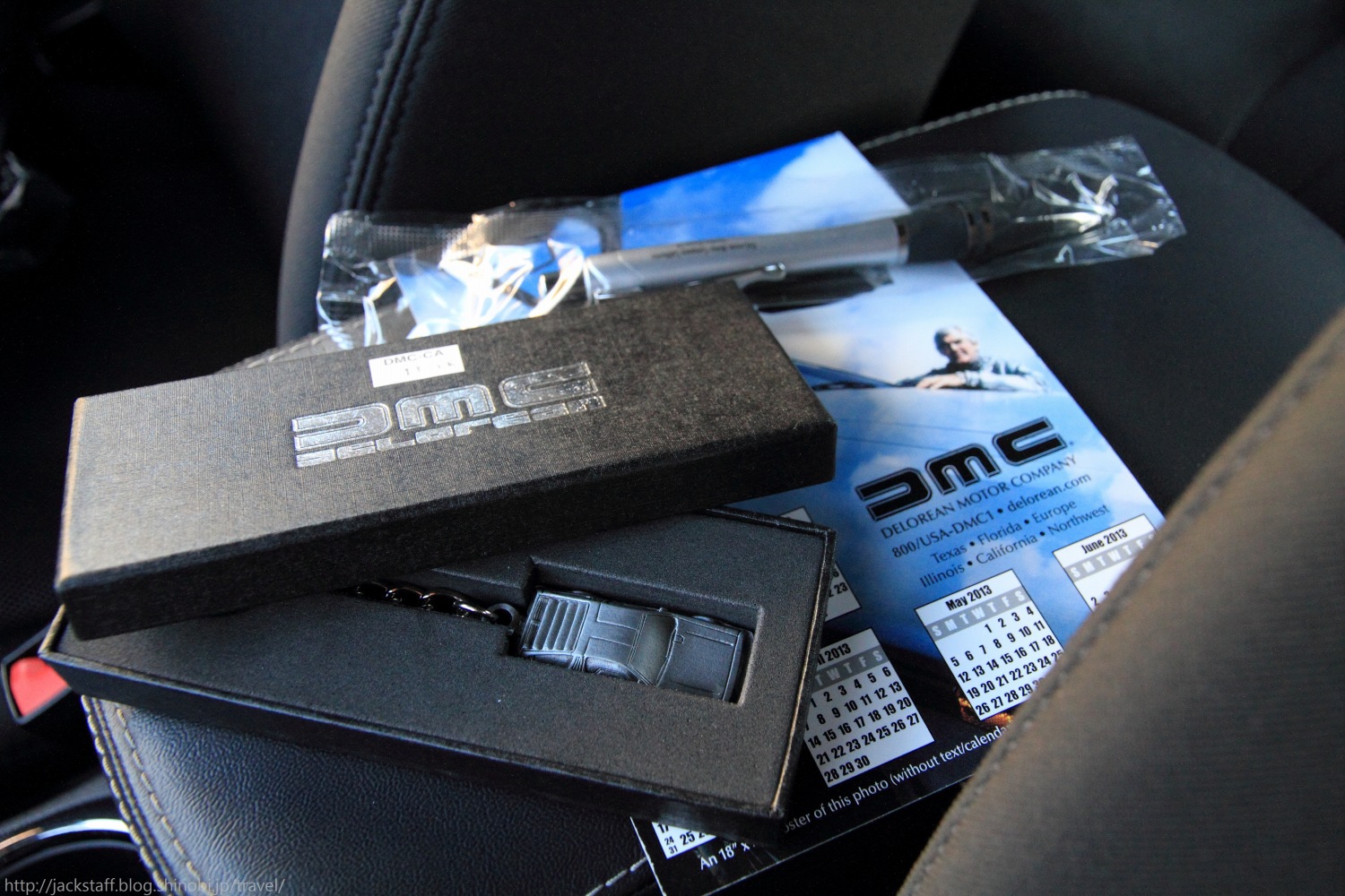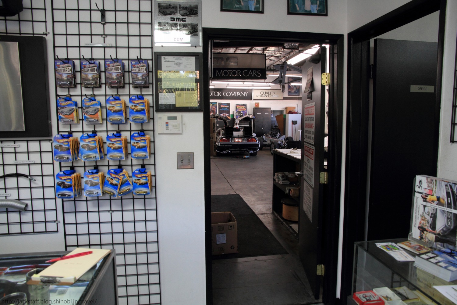 右:事務所に入るとすぐに奥のタイムマシン・デロリアンが見える。 またカリフォルニアに来た時は必ず寄るよ、とお礼を伝え工場を後にした。途中事務所でデロリアン・グッズを売っていたのでDMC-12のキーホルダーを記念に購入、おまけでペンとカレンダーを付けてくれた。 ちなみにここではパーツの購入ももちろん出来る。本物のバンパーを持ち帰るのも面白いと一瞬迷ったが、まぁ使い道も無いので止めておこう。 DeLorean Motor Company California