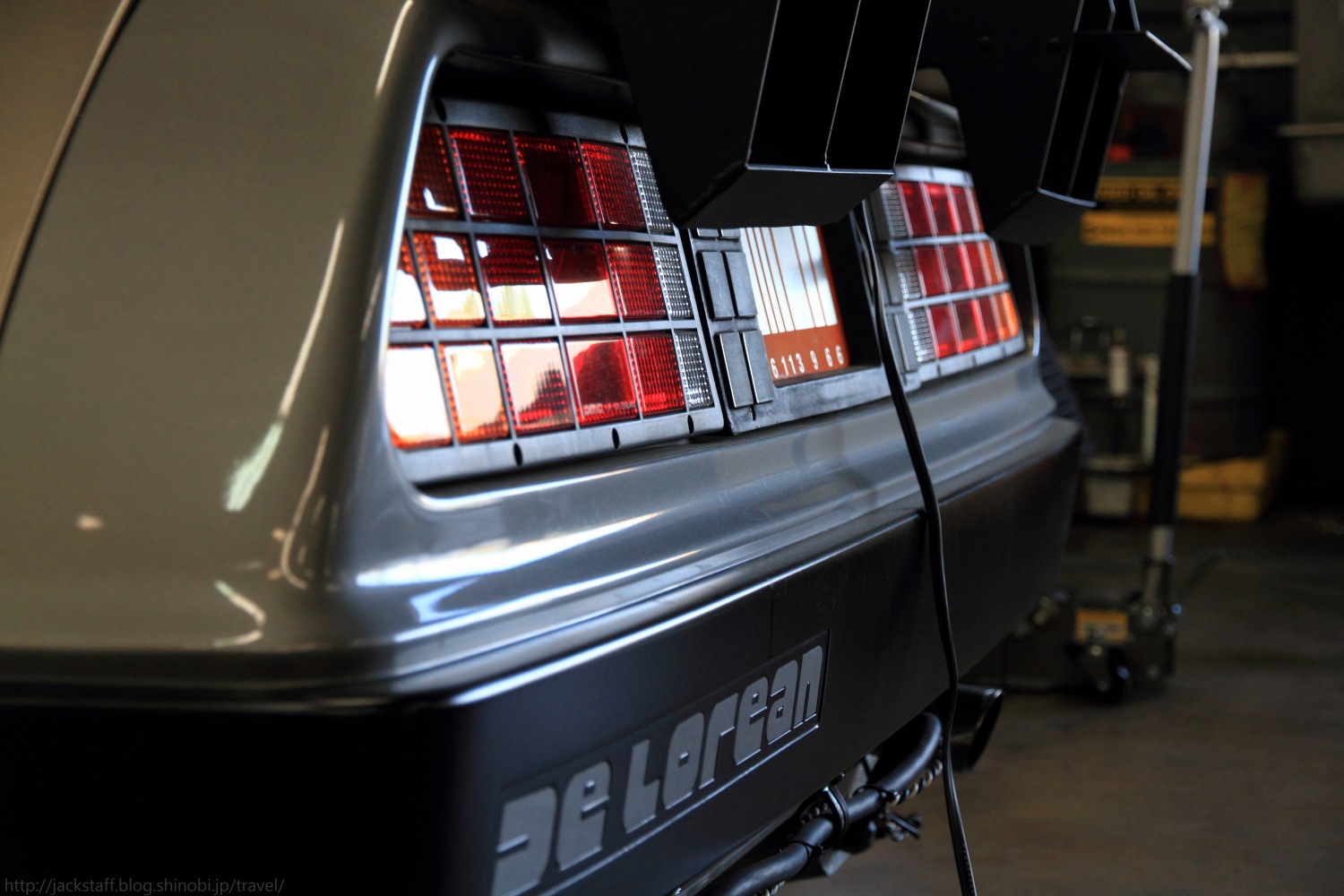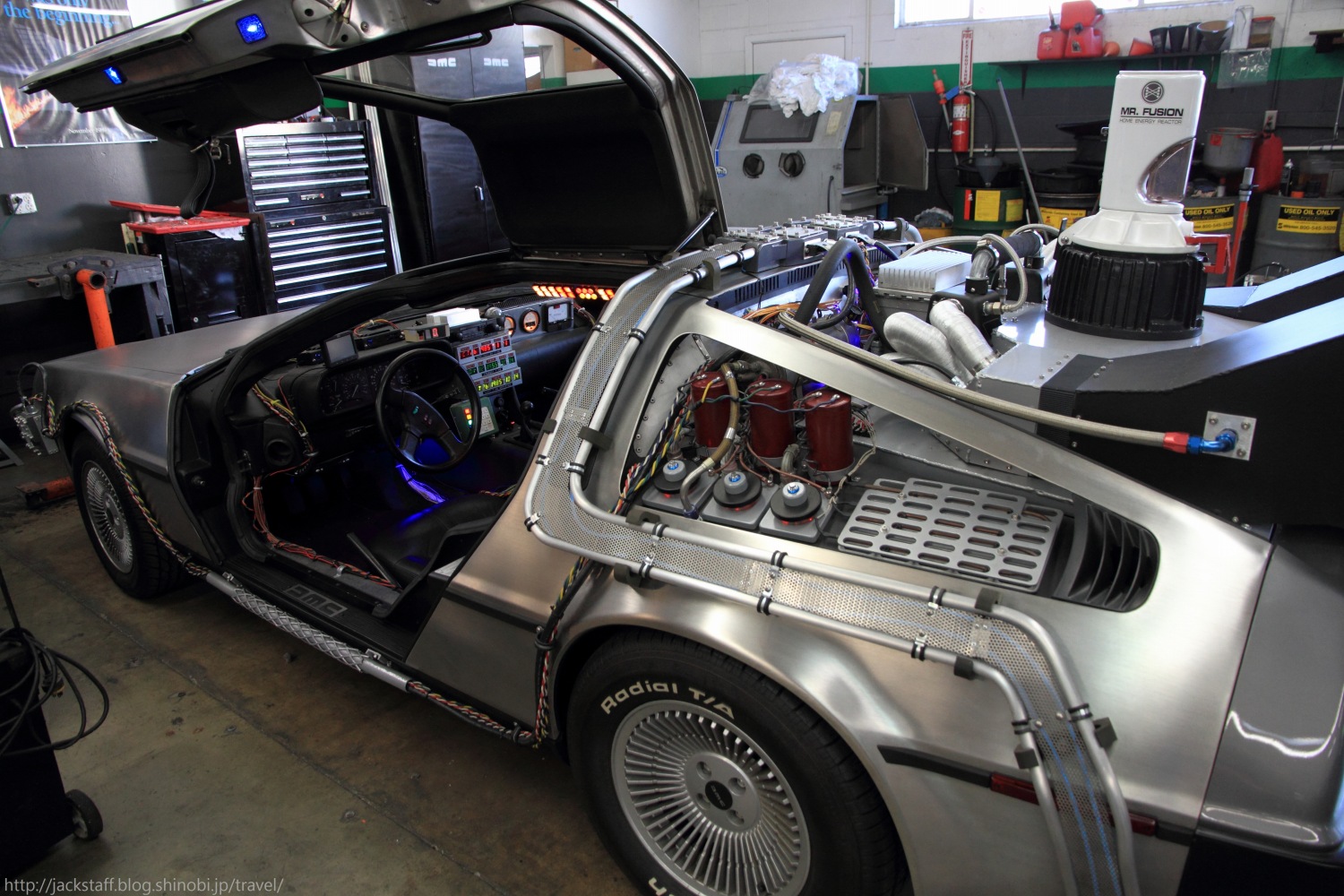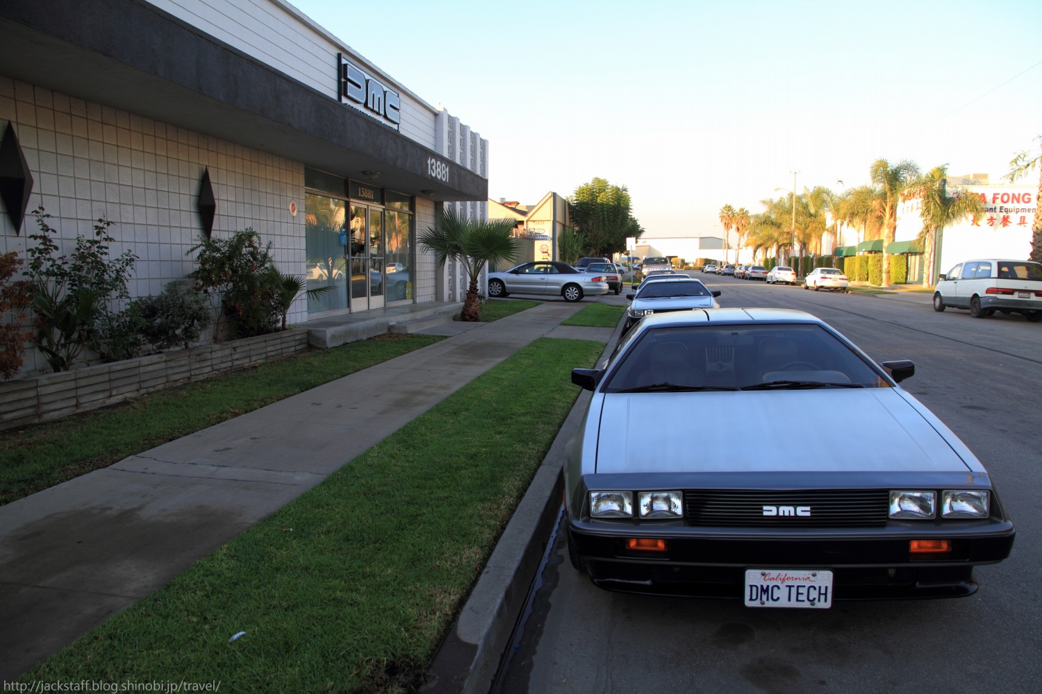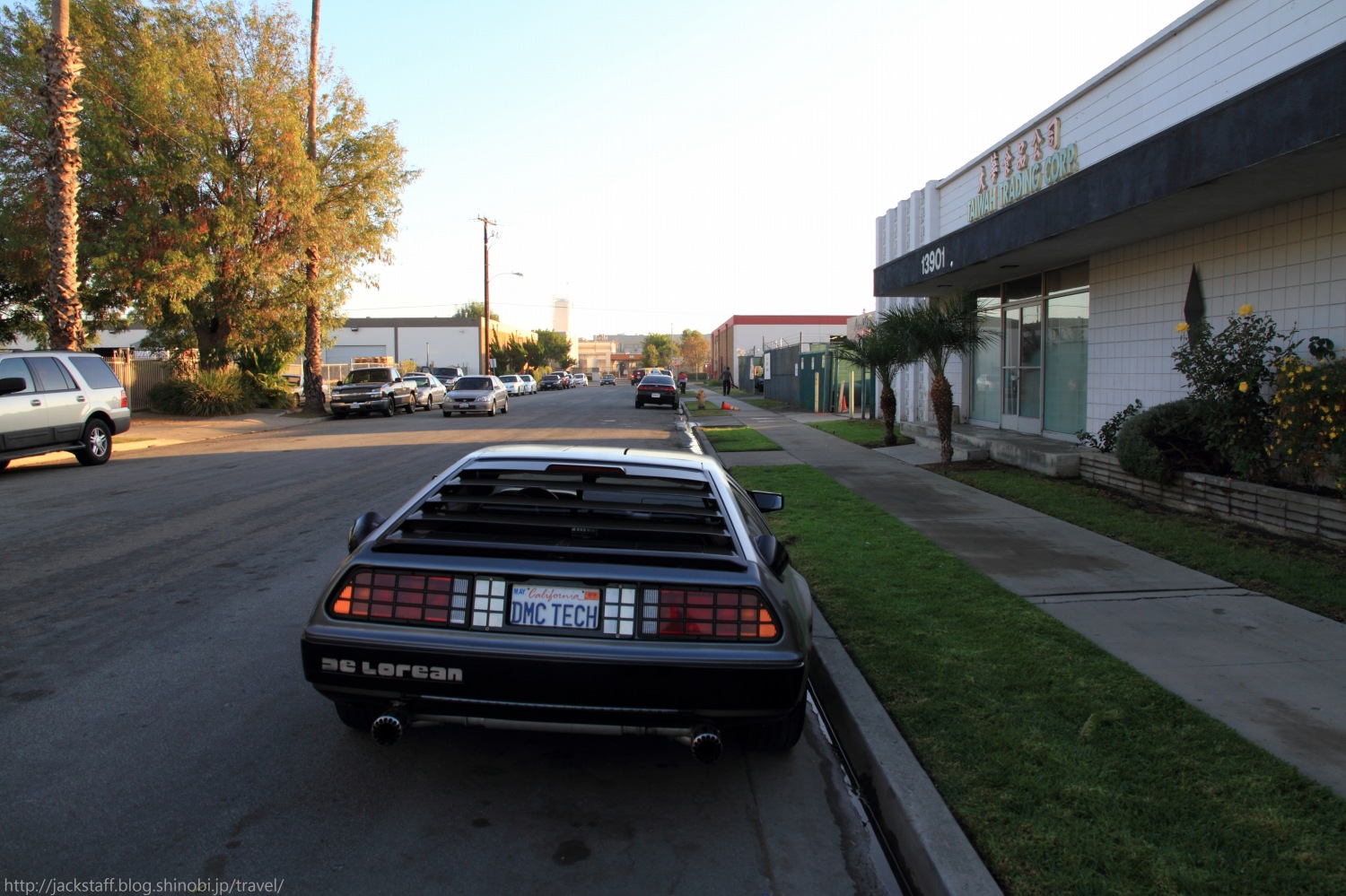 BTTF デロリアン 以前SNSで流れてきた一枚の写真があった。それはBTTFこと「バック・トゥ・ザ・フューチャー」のデロリアンを数年かけて自作してしまった、という写真だった。 この写真の出処がデロリアン・モーター・カンパニー・カリフォルニア、場所はガーデン・グローブ、アナハイムの近くだ。 レンタカーを借りたら行ける範囲内だと、出国前にその人物に見学したい旨をメールしていた。返事はOK、平日なら仕事をしているからいつでも見に来てくれ!といったフランクなメールが返ってきた。 今日はデロリアンを見学にそのDMCカリフォルニアへ向かう。 あった。ここがDMC、デロリアン・モーター・カンパニー・カリフォルニアだ。さっそく入り口前にずらりと並んだDMC-12が出迎えてくれる。これは技術スタッフのもののようだ、ナンバープレートにDMC TECHと印されている。 受付の女性に日本からメッセージを送った者だと説明すると快く奥へ通してくれた。自作デロリアンのオーナーであるダニーは電話対応で忙しそうであったが、その合間を縫って出てきてくれた。 さっそく「君はデロリアンオーナーかい?」と問われたが、日本では残念ながら手に入りにくい。カリフォルニアで暮らす時は買うよと伝えておいたが早速ヘビーな質問だ。 これが自作のバック・トゥ・ザ・フューチャー・デロリアンだ。 自作とは思えないほど完璧なまでに再現されている。おそらくこれはパート1のラストからパート2に登場するデロリアンだろう。思わず"Great Scott!!"と叫んだが笑われてしまった。 外部の電源スイッチを入れ、おもむろに運転席横のレバーを回すとあのタイムサーキットと次元転移装置が光り始めた。感動だ。あとは88マイル出すだけだが、もちろんこのバージョンは"We don't need roads"だ。 左:タイムサーキットだ。上から目標の時間、現在の時間、出発の時間となる。