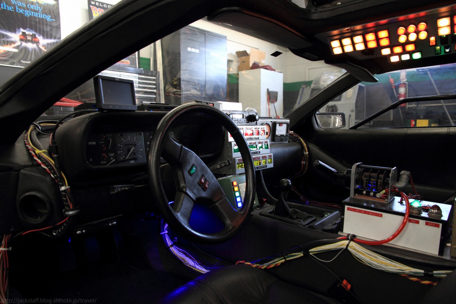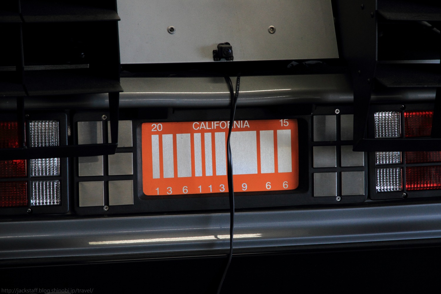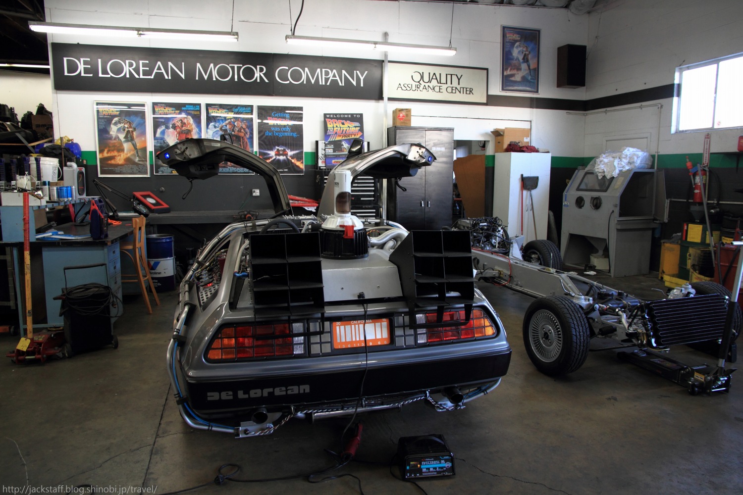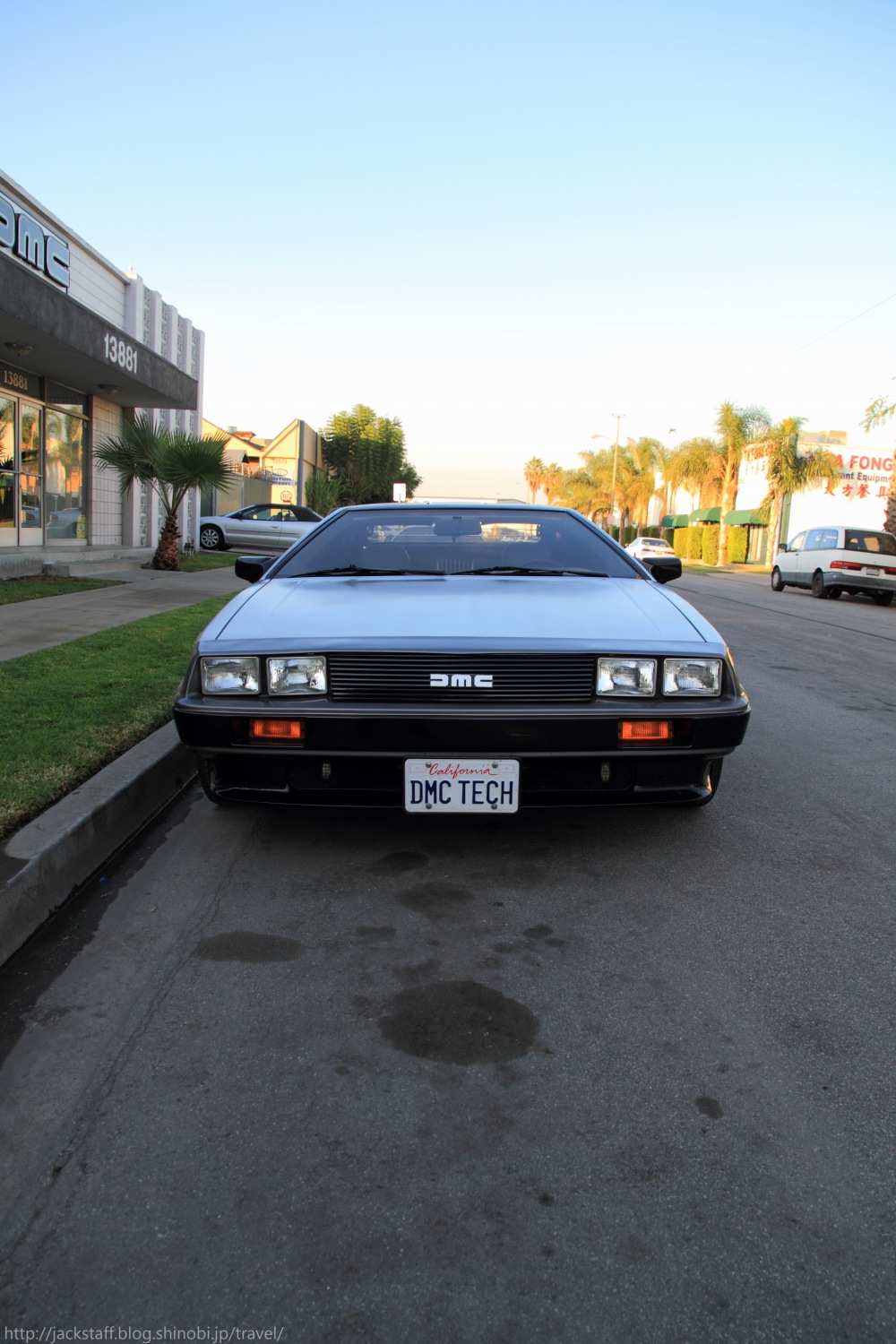 BTTF デロリアン 以前SNSで流れてきた一枚の写真があった。それはBTTFこと「バック・トゥ・ザ・フューチャー」のデロリアンを数年かけて自作してしまった、という写真だった。 この写真の出処がデロリアン・モーター・カンパニー・カリフォルニア、場所はガーデン・グローブ、アナハイムの近くだ。 レンタカーを借りたら行ける範囲内だと、出国前にその人物に見学したい旨をメールしていた。返事はOK、平日なら仕事をしているからいつでも見に来てくれ!といったフランクなメールが返ってきた。 今日はデロリアンを見学にそのDMCカリフォルニアへ向かう。 あった。ここがDMC、デロリアン・モーター・カンパニー・カリフォルニアだ。さっそく入り口前にずらりと並んだDMC-12が出迎えてくれる。これは技術スタッフのもののようだ、ナンバープレートにDMC TECHと印されている。 受付の女性に日本からメッセージを送った者だと説明すると快く奥へ通してくれた。自作デロリアンのオーナーであるダニーは電話対応で忙しそうであったが、その合間を縫って出てきてくれた。 さっそく「君はデロリアンオーナーかい?」と問われたが、日本では残念ながら手に入りにくい。カリフォルニアで暮らす時は買うよと伝えておいたが早速ヘビーな質問だ。 これが自作のバック・トゥ・ザ・フューチャー・デロリアンだ。 自作とは思えないほど完璧なまでに再現されている。おそらくこれはパート1のラストからパート2に登場するデロリアンだろう。思わず"Great Scott!!"と叫んだが笑われてしまった。 外部の電源スイッチを入れ、おもむろに運転席横のレバーを回すとあのタイムサーキットと次元転移装置が光り始めた。感動だ。あとは88マイル出すだけだが、もちろんこのバージョンは"We don't need roads"だ。 左:タイムサーキットだ。上から目標の時間、現在の時間、出発の時間となる。