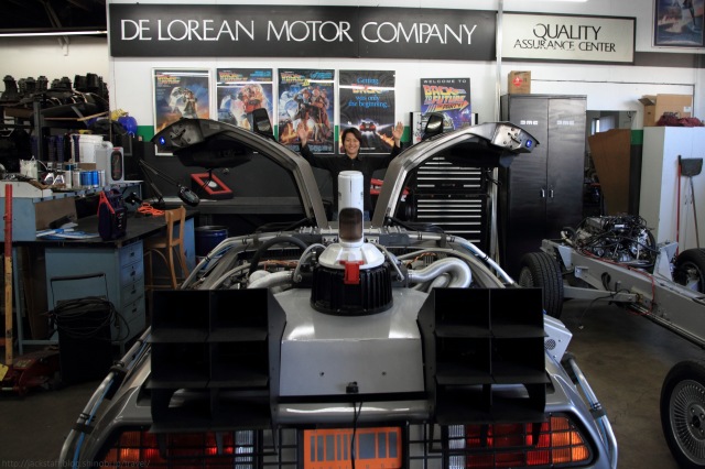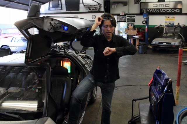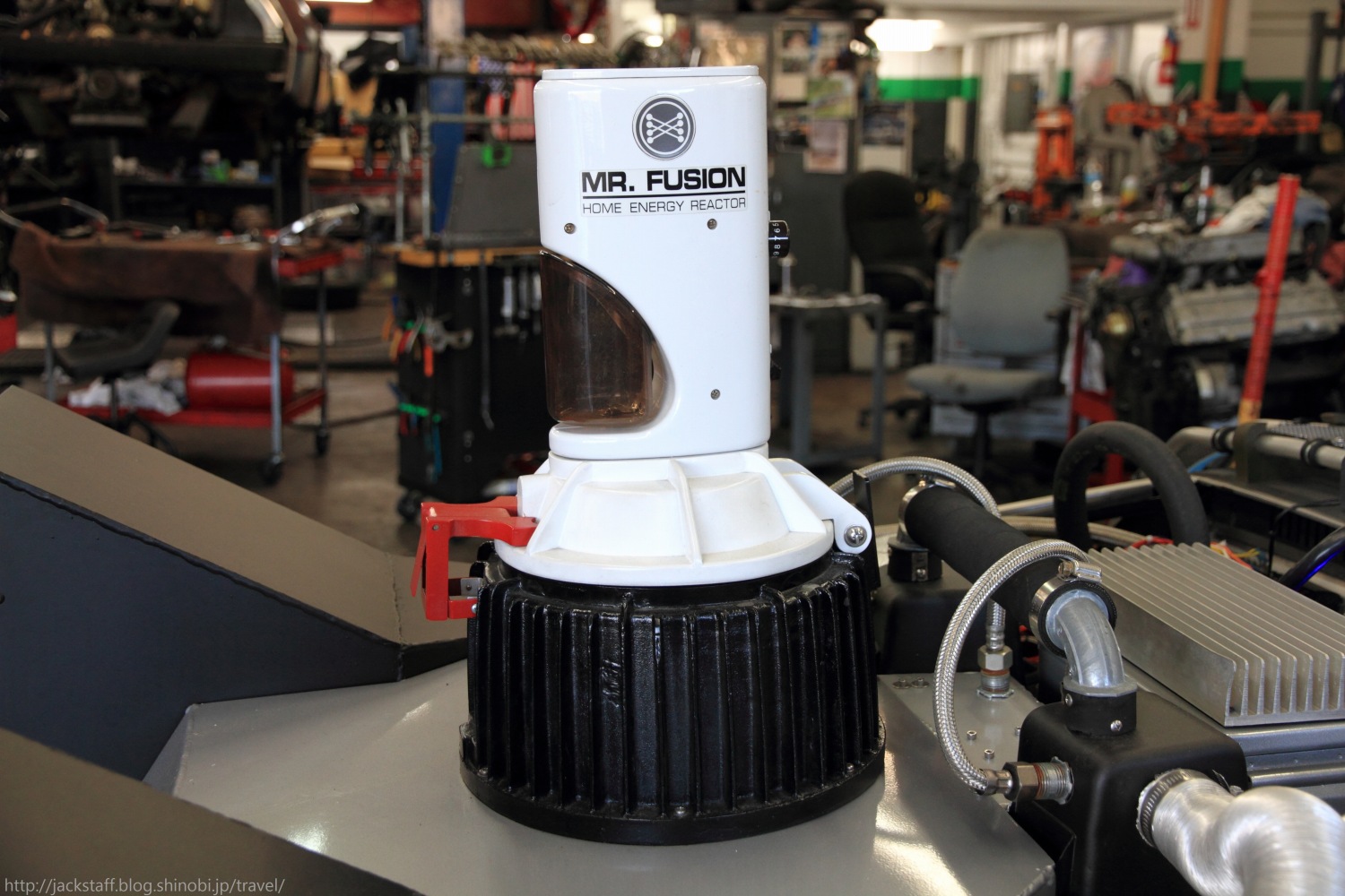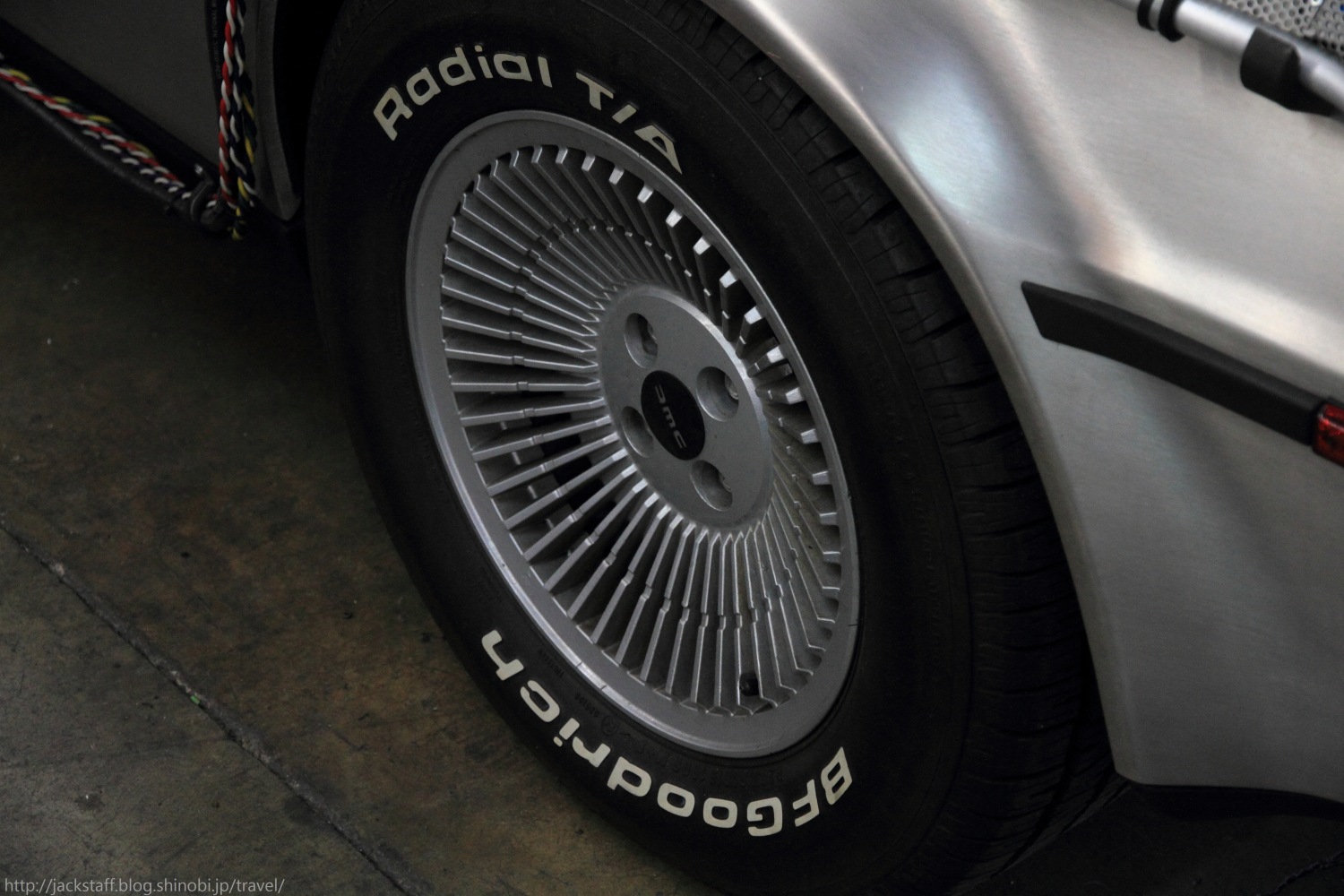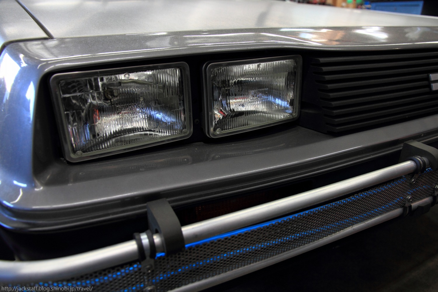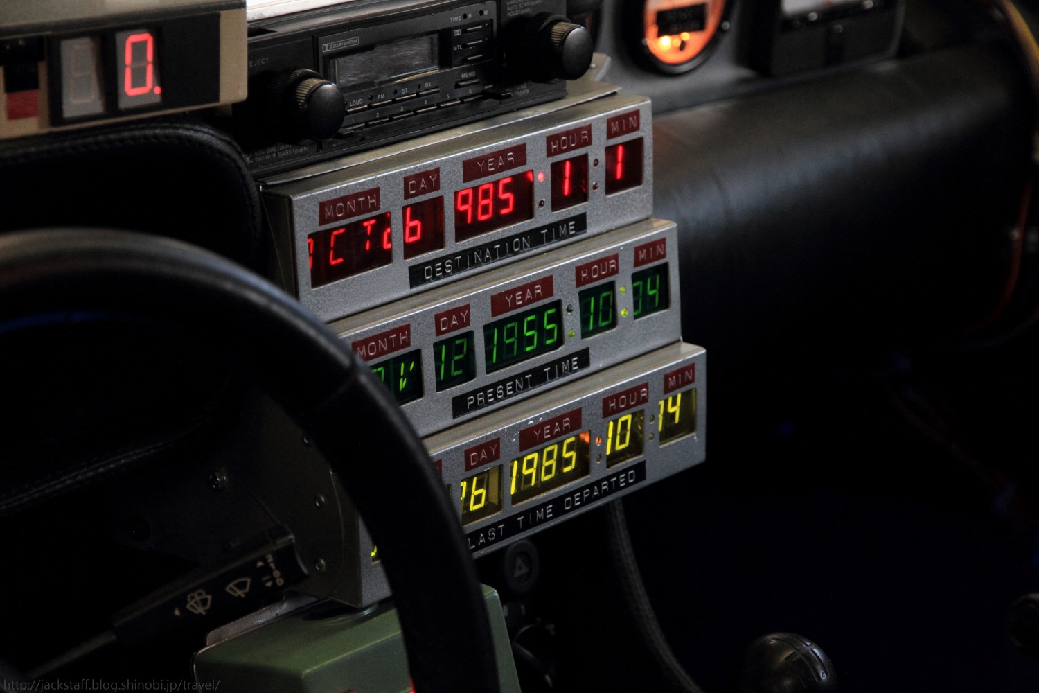 BTTF デロリアン 以前SNSで流れてきた一枚の写真があった。それはBTTFこと「バック・トゥ・ザ・フューチャー」のデロリアンを数年かけて自作してしまった、という写真だった。 この写真の出処がデロリアン・モーター・カンパニー・カリフォルニア、場所はガーデン・グローブ、アナハイムの近くだ。 レンタカーを借りたら行ける範囲内だと、出国前にその人物に見学したい旨をメールしていた。返事はOK、平日なら仕事をしているからいつでも見に来てくれ!といったフランクなメールが返ってきた。 今日はデロリアンを見学にそのDMCカリフォルニアへ向かう。 あった。ここがDMC、デロリアン・モーター・カンパニー・カリフォルニアだ。さっそく入り口前にずらりと並んだDMC-12が出迎えてくれる。これは技術スタッフのもののようだ、ナンバープレートにDMC TECHと印されている。 受付の女性に日本からメッセージを送った者だと説明すると快く奥へ通してくれた。自作デロリアンのオーナーであるダニーは電話対応で忙しそうであったが、その合間を縫って出てきてくれた。 さっそく「君はデロリアンオーナーかい?」と問われたが、日本では残念ながら手に入りにくい。カリフォルニアで暮らす時は買うよと伝えておいたが早速ヘビーな質問だ。 これが自作のバック・トゥ・ザ・フューチャー・デロリアンだ。 自作とは思えないほど完璧なまでに再現されている。おそらくこれはパート1のラストからパート2に登場するデロリアンだろう。思わず"Great Scott!!"と叫んだが笑われてしまった。 外部の電源スイッチを入れ、おもむろに運転席横のレバーを回すとあのタイムサーキットと次元転移装置が光り始めた。感動だ。あとは88マイル出すだけだが、もちろんこのバージョンは"We don't need roads"だ。 左:タイムサーキットだ。上から目標の時間、現在の時間、出発の時間となる。