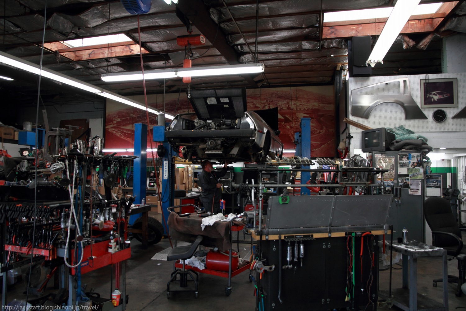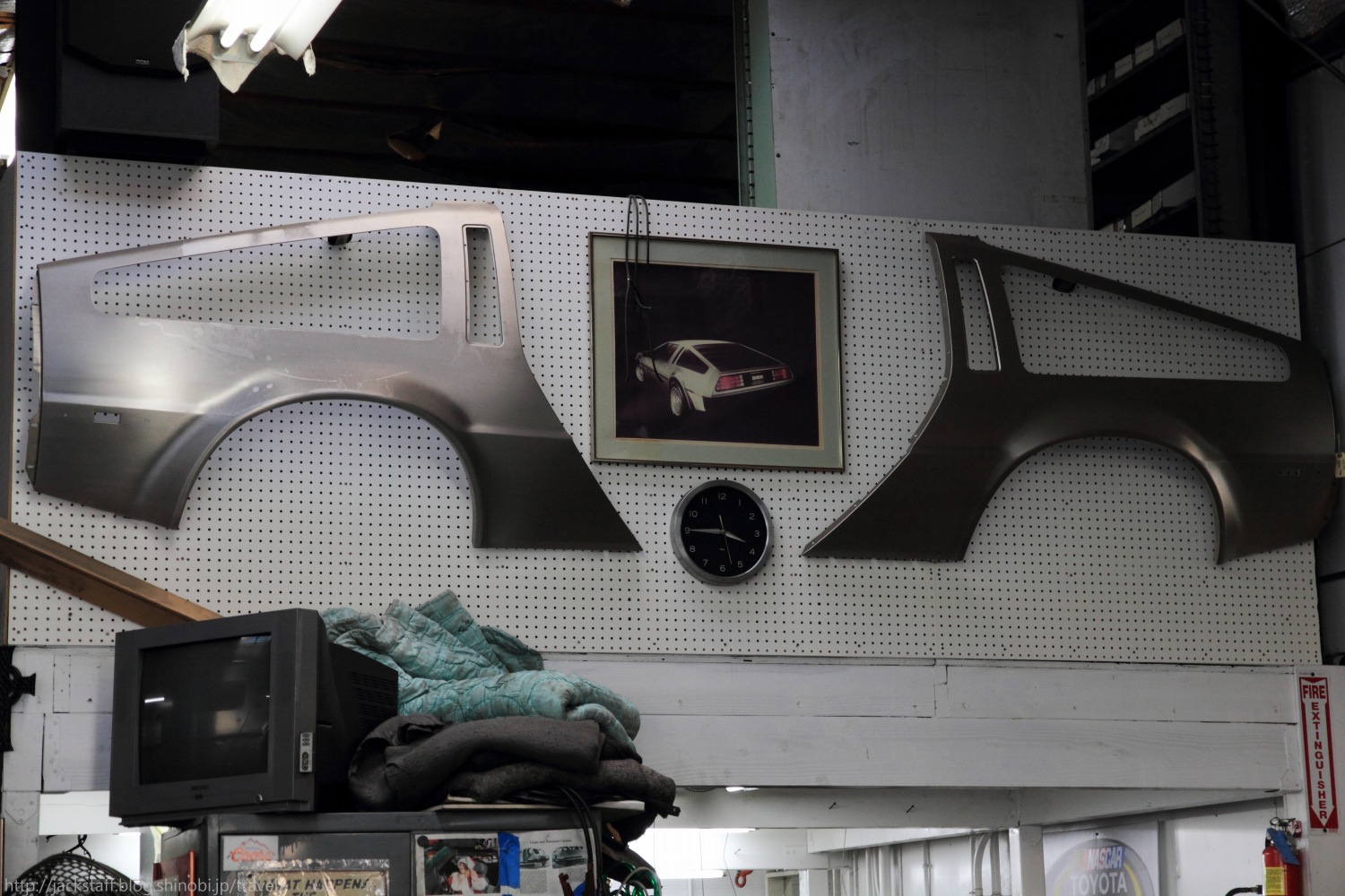 ここでダニーは仕事の電話のため事務所に戻り、適当に見ていてくれという言葉に甘え僕は暫く工場内を眺めて周ることにした。 一人ハイテンションでデロリアンの写真を撮っていると奥から体格のいいおじさんが顔を覗かせ、日本語の挨拶を交えながら話しかけてくれた。彼もまたここで働いているようだ。どこで日本語の挨拶を覚えたのか聞いたが、どうやら友人が日本で暮らしているらしい。 このおじさんも、とても気さくな方で整備中のDMC-12を見せてくれた。これだけの工具を使って整備して行くのだと言う。おじさんの若い頃の写真だろうか、奥さんらしき女性と写った写真が飾られていた。(右) ここで僕の持っていたカメラを見て、デロリアンと一緒に写真を撮ってくれると言う。カメラを渡すとあの特徴的なガルウイングを両方とも開き、車両の前に立つよう促された。車体を挟んで向かい合った形になるわけだ。 両手を上げると面白い画になるんだ!と言うことで撮ってもらった写真がこれだが、さっぱりよくわからない物に仕上がっていた。(下) せっかく写真を撮ってもらえるならこれをやらねば話にならない、とおじさんの掛けていたメガネを借りてパート1の格好をしてみたのだが詰めが甘かった感は否めない。三脚を持って来ていたらおじさんと共にパート2が出来たのにと少し後悔したがそれはデータを取り込んだ後に思いついた。 こんな感じでこのおじさんと暫く遊んでいたのだが、後に調べて実はこの人、「アメリカで現在も働いている唯一のデロリアン公認整備士」のドン・シュテーガーであることが分かりぶったまげた。 おっちゃんメガネ貸してや!などと絡んでいたおじさんが実は、30年以上前に工場が閉鎖される以前からデロリアンのメカニックとして働いていた人だったのだ。 YouTubeにこんな番組があったので紹介しておこう。 タイヤに座って話をしているおじさんがドンだ。 from /DRIVE