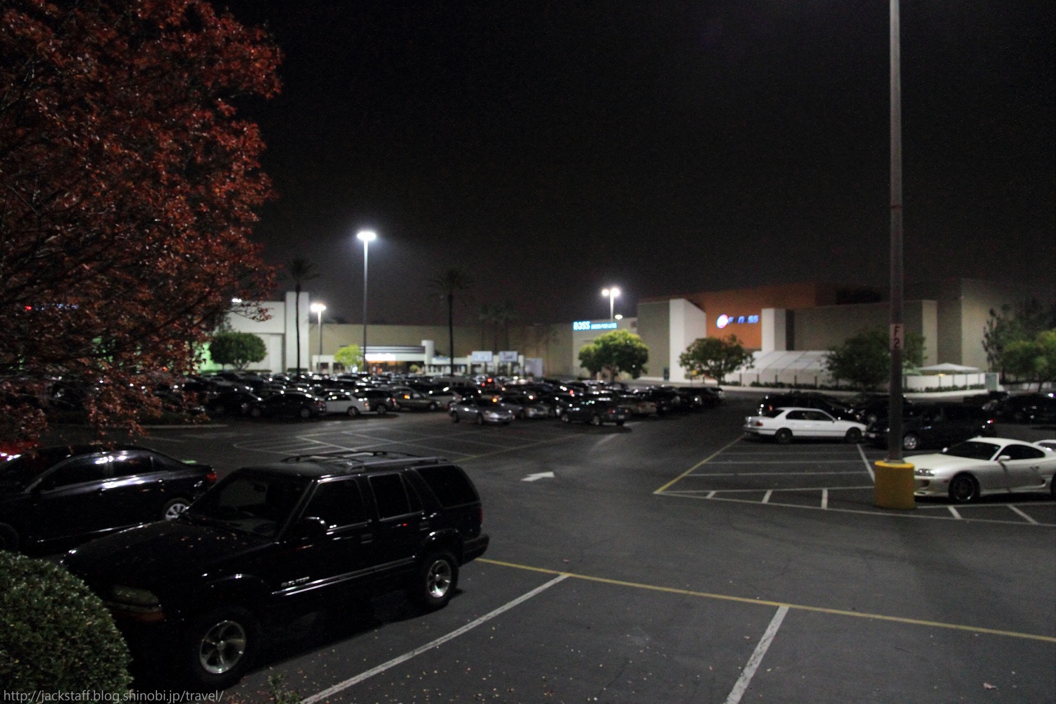 13881 West St, Garden Grove, CA 92708 http://www.deloreanmotorcenter.com/ ※先日ダニーから店舗移転と新店舗オープンパーティーのお誘いメールが入っていた。 どうも下記住所に移転したらしく丁度9/27からオープンだったようだ。 もしこれから見に行かれる方は是非新しい店舗に足を運んでみてほしい。 (僕もパーティーに行きたかった。) NEW DeLorean Motor Company California 7402 Prince Drive Huntington Beach, California 92647 実はもう一件寄りたい場所があり、北へ車を走らせる。 このDMCカリフォルニアに来たあとには必ず行かなければならない場所、「バック・トゥ・ザ・フューチャー」でドクが最初にデロリアンを紹介するツイン・パイン・モールのロケ地が近いのだ。 到着した頃にはすっかりあたりも暗くなりあのシーンの雰囲気も出てきたような気がする。 しかし誤算だった。実際到着するまではよかったのだが、予想していたよりもとてつもなく大きな施設でどの面が使われた場所なのか分からなくなってしまったのだ。Wi-Fiはつかめず、頼りになるのはキャプチャしてきた本編の画像だけ。おまけに夜の買い出し時であたりは車で埋まっていた。 X状になっているので可能性があるのが四面あるのだが、それぞれの間に段差がある場所もあり、車で移動するには一度駐車場から出る必要がある。そのため車での散策を諦め徒歩で照らし合わせながら歩いて行くことにした。 ぐるりと回った反対側あたりでどうも似ている地形の場所を発見するが撮影からもう20年以上も経っているので合っているのかわからなくなってしまった。 とりあえずそこでマーティンのごとく走り込んで二、三枚撮影してみたのがこれだ(下)。取り込んでからもう一度本編を見ながら確認してみたが、たぶんこの場所だ。しかし残念なことに撮影時よくわからなくなって適当に撮ったので全て前ピンになり過ぎていた。 夜のショッピング・モール撮影は、ヘビーだ。 こぼれ話 「ワン!ポイントッ!トゥエニーワン!ジゴッ!!ワッッ!!!」 ジゴを? ギガの訛りかもだぜ。 こいつぁコトだ! 旅のお供