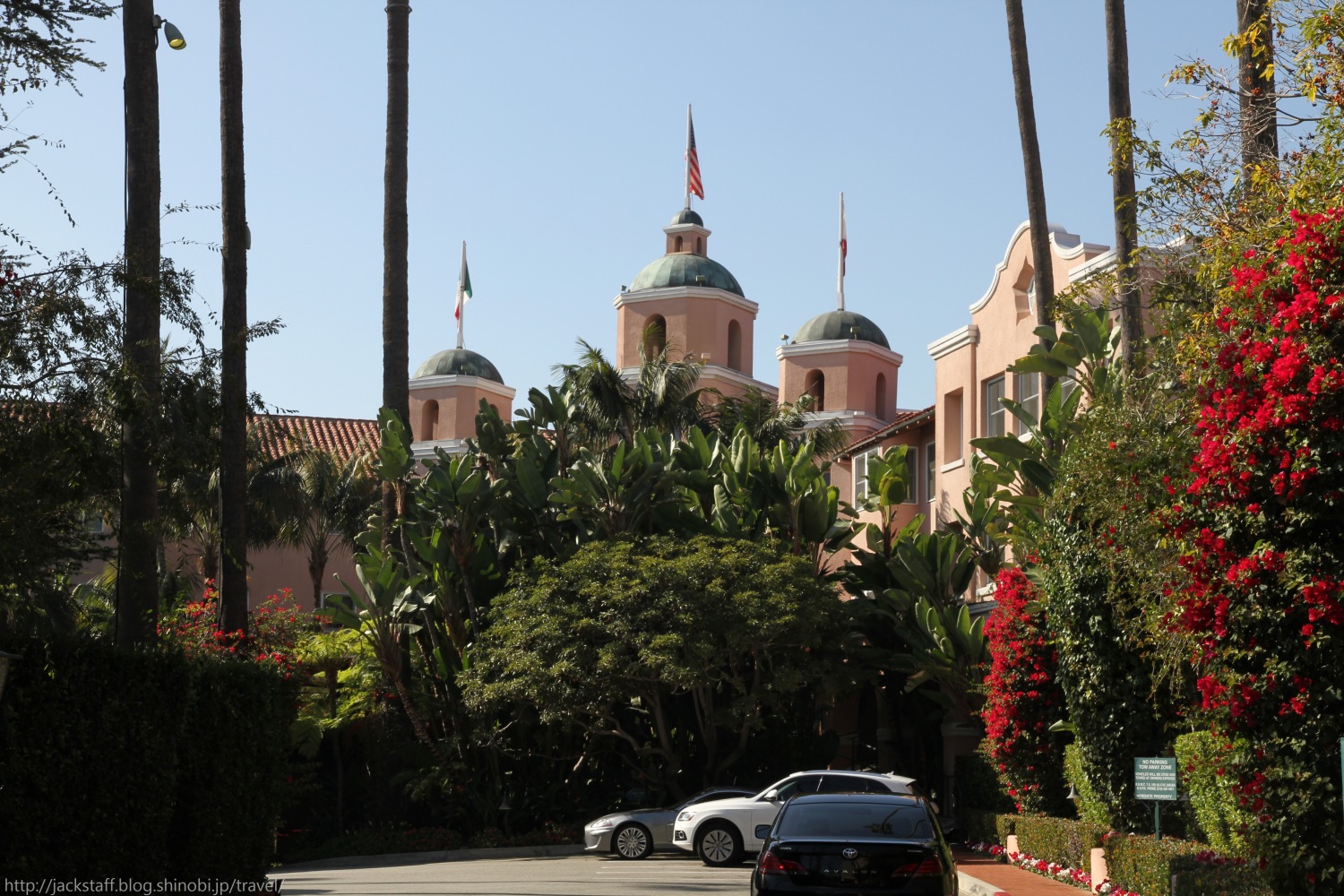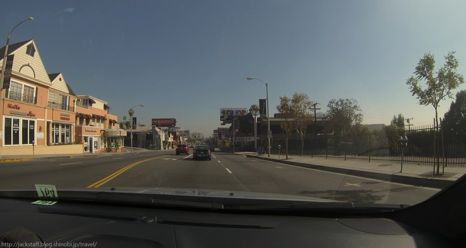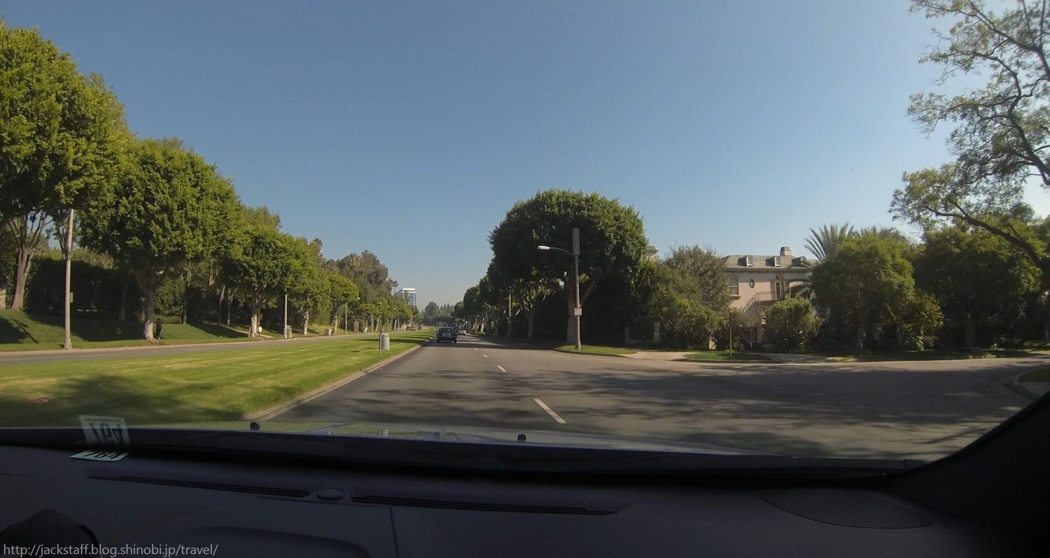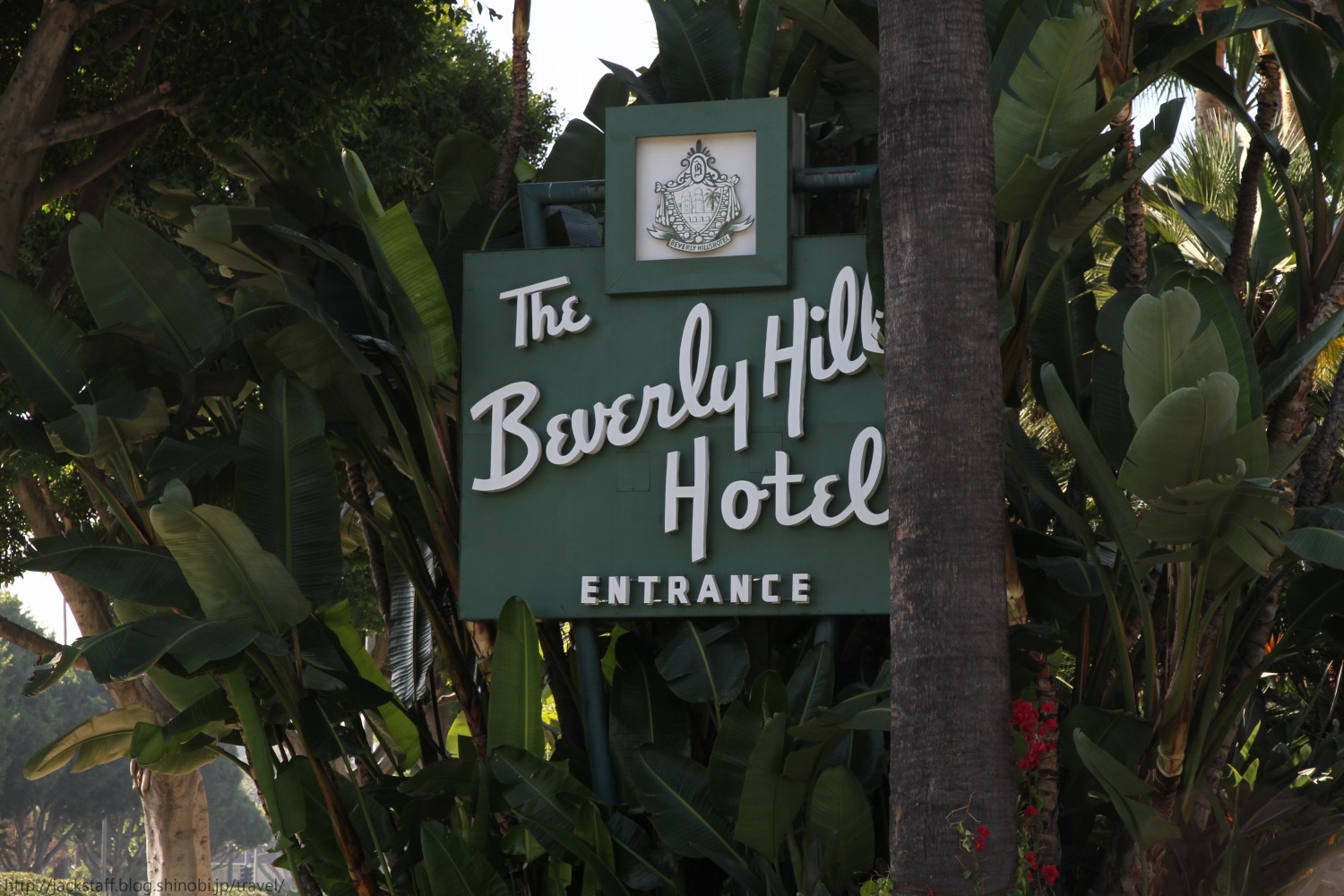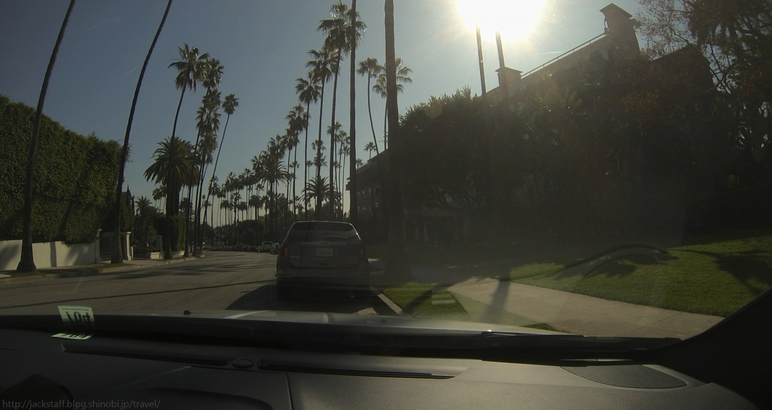 1304 7th St, Los Angeles, CA 90057 ロサンゼルスはそれこそ街自体が大きなロケセットのような物で、至る所に有名作品のロケ地が点在している。観光地などはそのまま使われている場合が多いし、ダウンタウンのビル群はよくモンスターパニック映画で破壊されているので普通に歩いているだけでも巡礼することが出来る。 しかし今回は車で回ることが出来たので点在しているロケ地を一気に見て回ることにした。と言っても時間の都合と事前調査不足でそこまで多くは回れなかったが、実際の建物を見ることが出来るのは嬉しい。 まずやってきたのはビバリーヒルズだ。ビバリーヒルズという地名だけでも数多くの作品を思い出すし、大物セレブたちの大豪邸が立ち並んでいるのもここだ。 しかし今回向かったのはこの場所「ビバリーヒルズ・ホテル」で、さらにここは映画のロケ地ではない。 サンセット・ブールヴァードを走っているとクレセント・ドライブとビバリー・ドライブの交差点に看板が立っているのが見えてくる。 ここは1976年に発表されたイーグルスの5枚目のアルバム、そうあの「ホテル・カリフォルニア」のジャケットになっているホテルなのだ。 実際は大変歴史のある高級ホテルの一つで、多くのハリウッドスターや映画関係者がここに滞在している。宿泊はしていないため、車を乗り入れうっかりボーイに持って行かれても困るので外からの撮影だけにしたが、どうやら中を見学出来るツアーもあるらしい。 ぐるっと周りを眺めてさぁ次を目指そう。 "On a dark desert highway―"と口ずさみながら真っ昼間のビバリーヒルズを南に進む。 The Beverly Hills Hotel