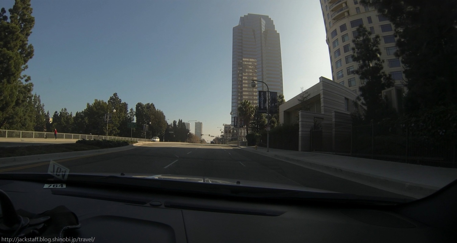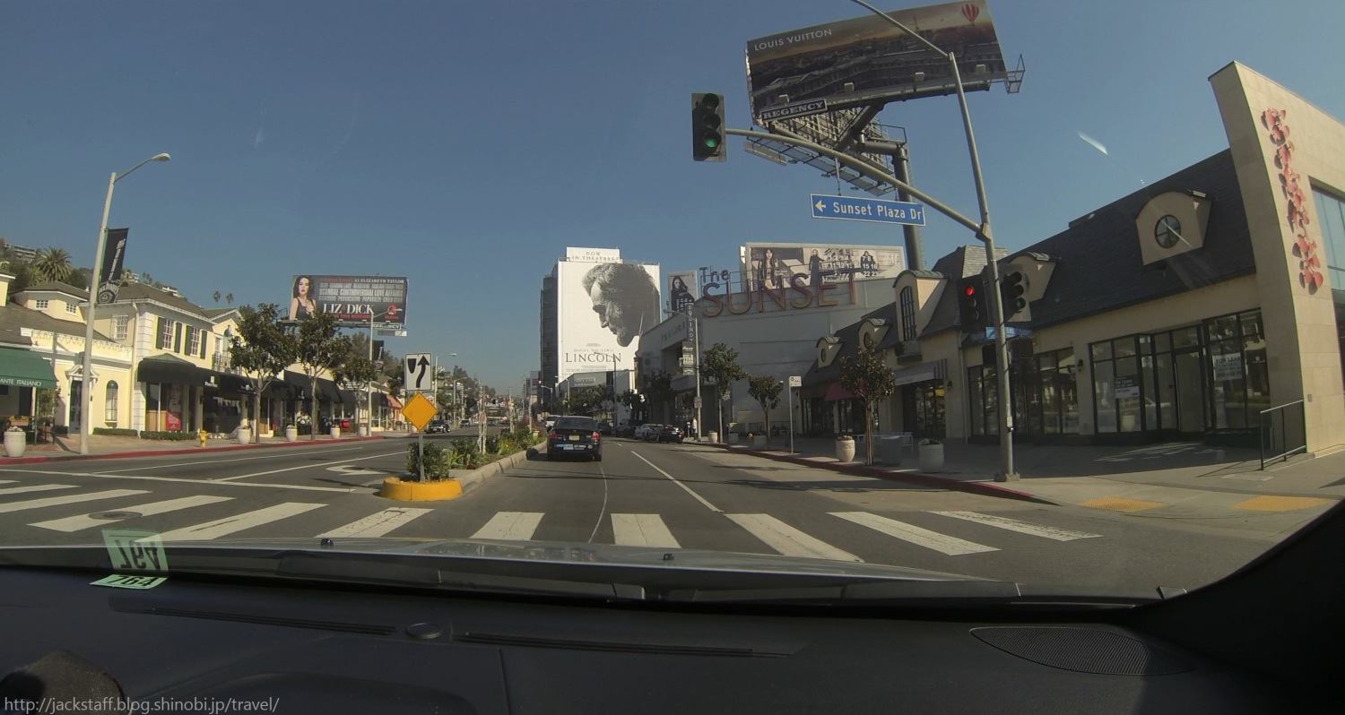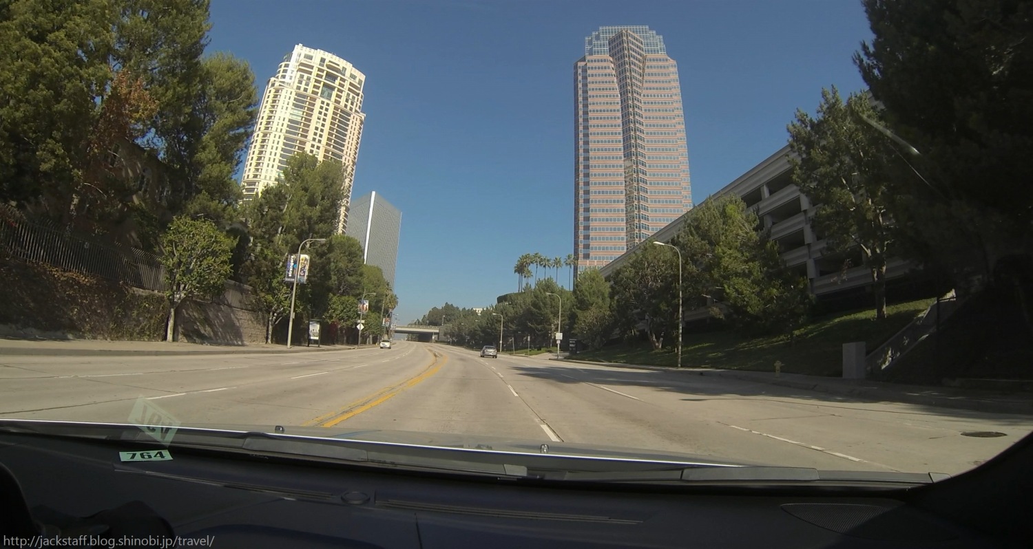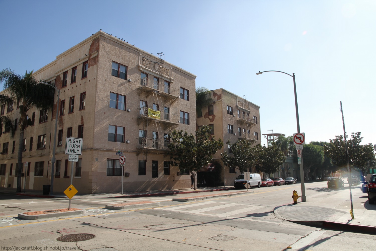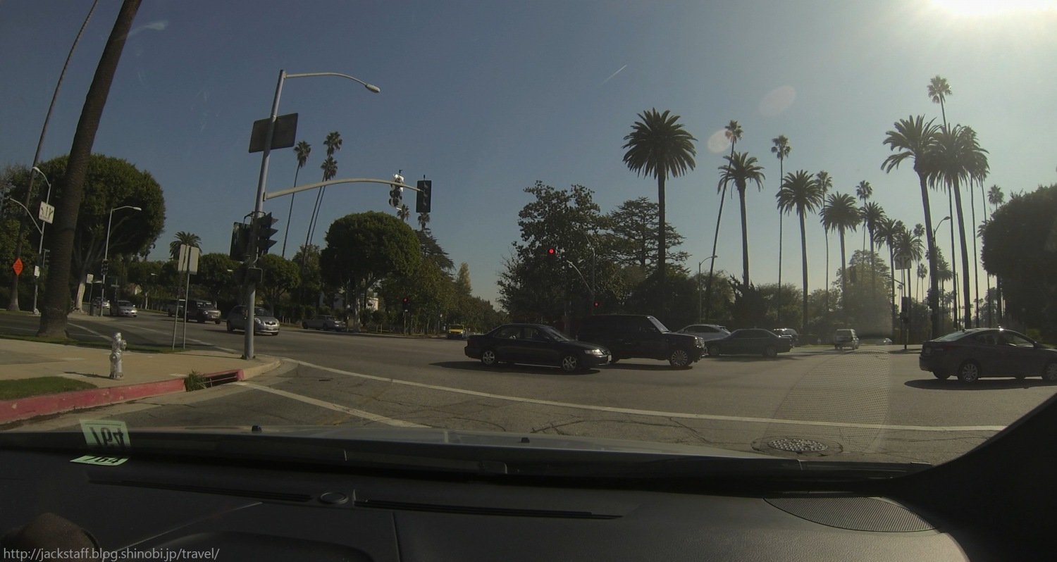 1304 7th St, Los Angeles, CA 90057 ロサンゼルスはそれこそ街自体が大きなロケセットのような物で、至る所に有名作品のロケ地が点在している。観光地などはそのまま使われている場合が多いし、ダウンタウンのビル群はよくモンスターパニック映画で破壊されているので普通に歩いているだけでも巡礼することが出来る。 しかし今回は車で回ることが出来たので点在しているロケ地を一気に見て回ることにした。と言っても時間の都合と事前調査不足でそこまで多くは回れなかったが、実際の建物を見ることが出来るのは嬉しい。 まずやってきたのはビバリーヒルズだ。ビバリーヒルズという地名だけでも数多くの作品を思い出すし、大物セレブたちの大豪邸が立ち並んでいるのもここだ。 しかし今回向かったのはこの場所「ビバリーヒルズ・ホテル」で、さらにここは映画のロケ地ではない。 サンセット・ブールヴァードを走っているとクレセント・ドライブとビバリー・ドライブの交差点に看板が立っているのが見えてくる。 ここは1976年に発表されたイーグルスの5枚目のアルバム、そうあの「ホテル・カリフォルニア」のジャケットになっているホテルなのだ。 実際は大変歴史のある高級ホテルの一つで、多くのハリウッドスターや映画関係者がここに滞在している。宿泊はしていないため、車を乗り入れうっかりボーイに持って行かれても困るので外からの撮影だけにしたが、どうやら中を見学出来るツアーもあるらしい。 ぐるっと周りを眺めてさぁ次を目指そう。 "On a dark desert highway―"と口ずさみながら真っ昼間のビバリーヒルズを南に進む。 The Beverly Hills Hotel