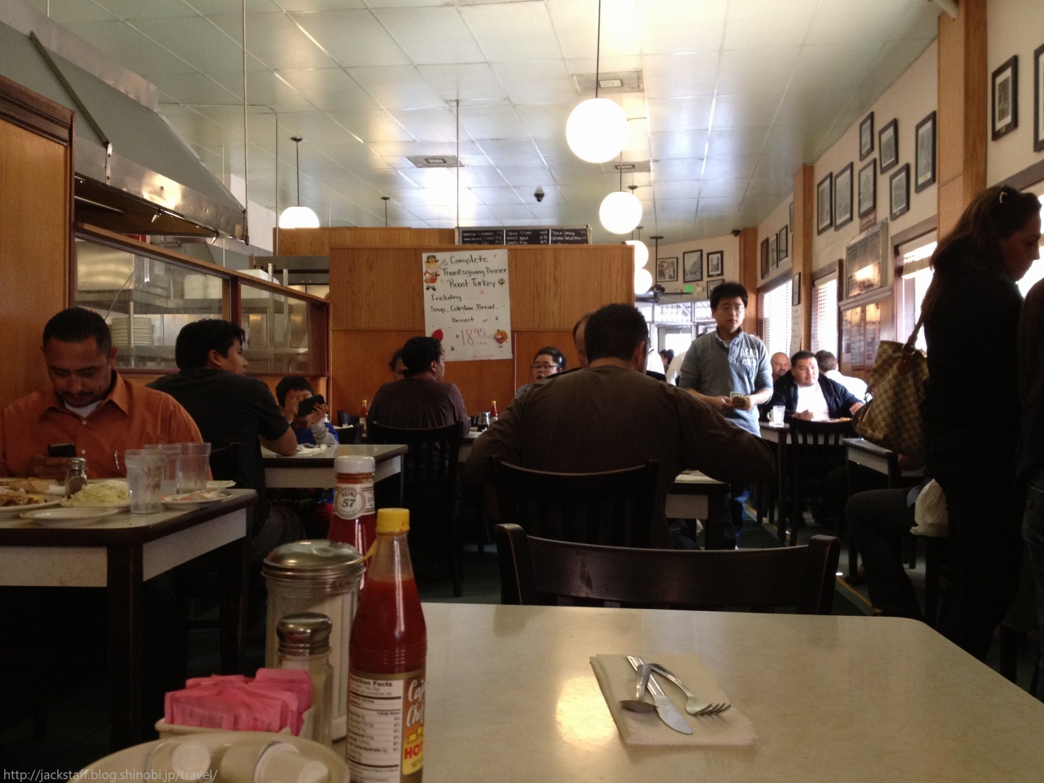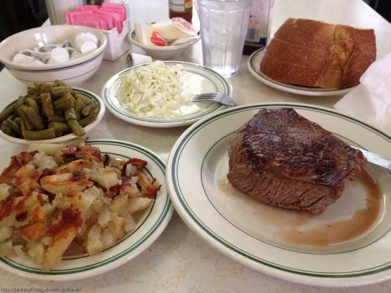 http://www.in-n-out.com/ アメリカの食文化と言うと、バーガーにBBQ(今回は残念ながら機会が無かったが。)そしてステーキだ。 ここはダウンタウンにあるステーキ・ハウスなのだが、ガイドブックに有名店として紹介されているのを見て食べに行った。優雅にもランチに行ったのだがそこそこの行列が出来ていて、少し待ってから入店。確か注文したのはNew Yorkと呼ばれる部位のステーキで色々付いたセットで$18.45だ。 まずは先にサイドメニューから到着、これをつつきながらメインディッシュが届くのを待つわけだ。それにしてもこのコールスローが素晴らしく美味い。 しばらくしてから念願のステーキが到着、見た目はかなり分厚い、が、味はまぁほどほどと言ったところか。少し期待し過ぎていたようだ。それにしてもコールスローが美味い。そうだ僕はコールスローを食べに来たんだ。 ちなみにこちらキャッシュ・オンリーでカードが使えないのだけ注意が必要だ。量が多かったためバケットだけドギーバッグで持ち帰った。 さて、ここからはこれまでの記事と多少被る場所もあるが改めてロケ地として紹介しておこう。 壁面にもデカデカと書かれているがここは、ジャッキー・チェンとクリス・タッカーのアクションコメディー、ラッシュアワーのロケ地だ。ジャッキーとクリスがWarを歌いながら銃で一通り遊んだ後に踏み込むのがこの中華レストランなのだ。店内にも写真が飾ってある。 バック・トゥ・ザ・フューチャーのツイン・パイン・モール(ローン・パイン・モール)のロケ地だ。実際は大型スーパーでこの日は夕飯の買い出し時と被り、ゆっくり場所を探すことが出来なかった。 適当に数枚撮ってきたうちの一枚だが、おそらくこの場所が最初にデロリアンをお披露目した広場なはずだ。故にボケている。 前回の記事