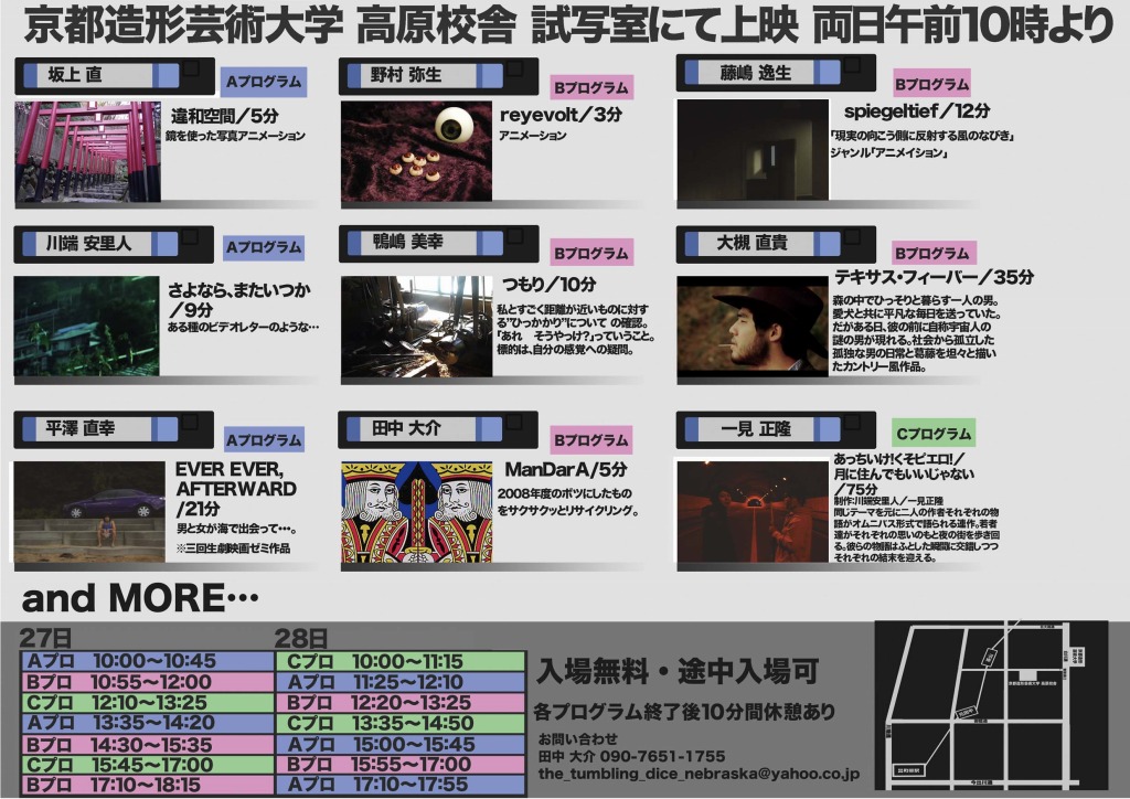合同上映会「VIDEOVICTIM」 2008.2.27(FRI)-28(SAT) AM10:00から 京都造形芸術大学 高原校舎・試写室 入場無料・途中入場可 同期の友人を中心とした映像作品の上映会です。 私の「テキサス・フィーバー」もリバイバル上映されます!前回DOZERを見逃された方も、バッチリ見たという方も是非お越しください!! 27日は私もたぶん一日いると思います。ちょっと音楽とか手直ししてるのでまぁ気が向いたらどうぞ(笑 もしかしたら最新作「BARIQUAND2」の初公開CMとかも見れちゃうかもしれませんよ? ちなみに今回は映像ホールではなく「高原校舎・試写室」ですのでお間違えなく!(造形大前から東鞍馬口を西へ。セブンイレブンの手前左手。・・・だよね?)分からない場合は連絡ください。 テキサス・フィーバー詳細 VIDEOVICTIMフライヤー表 VIDEOVICTIMフライヤー裏 Aプロ 違和空間/5min./坂上直 さよなら、またいつか/9min./川端安里人 EVER,EVER,AFTERWARD/21min./平澤直幸 Bプロ reyevolt/3min./野村弥生 つもり/10min./鴨嶋美幸 ManDarA/5min./田中大介 spiegeltief/12min./藤嶋逸生 テキサス・フィーバー/35min./大槻直貴 Cプロ あっちいけ!くそピエロ & 月に住んでもいいじゃない/75min./川端安里人・一見正隆 27日 Aプロ 10:00-10:45 Bプロ 10:55-12:00 Cプロ 12:10-13:25 Aプロ 13:35-14:20 Bプロ 14:30-15:35 Cプロ 15:45-17:00 Bプロ 17:10-18:15 28日 Cプロ 10:00-11:15 Aプロ 11:25-12:10 Bプロ 12:20-13:25 Cプロ 13:35-14:50 Aプロ 15:00-15:45 Bプロ 15:55-17:00 Cプロ 17:10-17:55 mixiとかにもCM載せてたりするので見れる方はご覧ください。