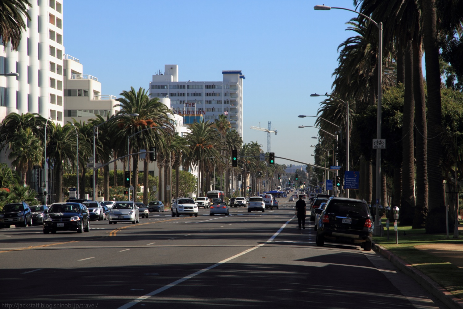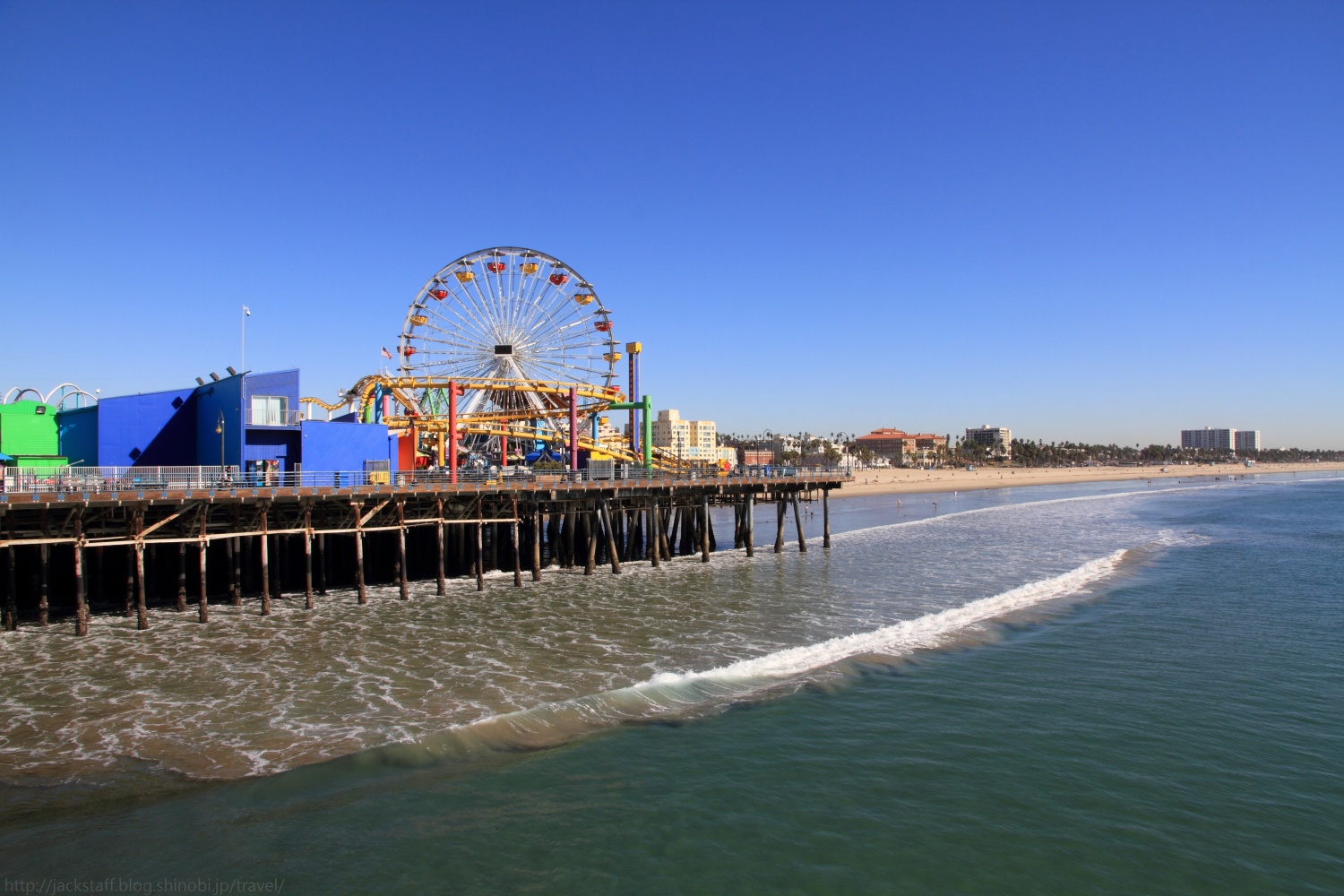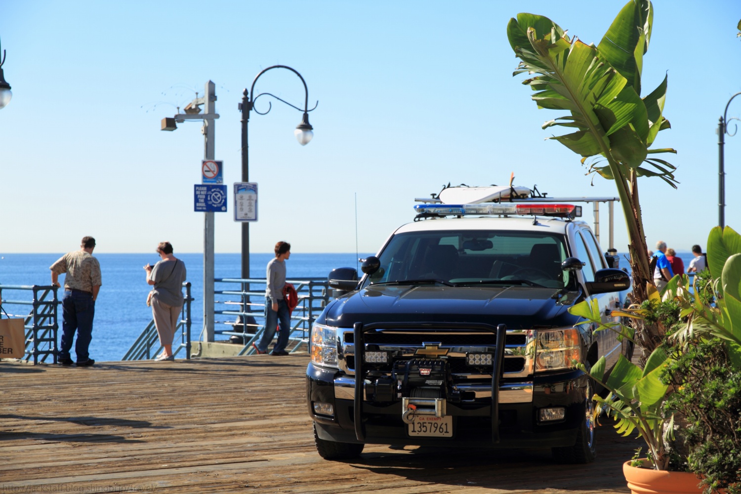 サンタモニカ・ピア 国内旅行でもそうだが、旅先では宿泊地の周辺を歩いて回るのが好きだ。 車があるとすぐに遠くへ行ってしまうが、歩きは帰りのことも考えるからか宿を中心に円を描くようにじっくりと散策することが多いので、車では見落としてしまうような小さな発見がたくさんあって面白い。出来るだけイヤホンは付けない、耳からの情報にもまた多くの発見があるからだ。 ロサンゼルス到着の翌日、空は青く澄み渡り痛いくらいの日差しが照りつける快晴だった。とても心地が良く、まさにイメージしていたカリフォルニアそのものだ。気温は長袖でちょうどよいくらいだが、日陰に入ると少し肌寒い。 まず現地に着いたらプリペイド式の携帯電話を買おうと思っていたので、昨夜のサード・ストリート・プロムナードを歩く。夜とはまた違った印象でリゾート地の風格を醸し出している。 何件かエレクトリック・ストアをまわり最終的に紹介されたT-Mobileというチェーン店へと向かった。ウィルシャー・ブールヴァード上にある店だ。 プリペイド携帯はあったものの、確かプリペイド番号と本体のセットで最安値が80ドル。予想していたよりも値が張ってしまったため断念した。 だが案内をしてくれていた店員のスレンダーで褐色美女のお姉さんは諦めきれなかったのか、iPhoneを持っているならSIMだけ入れ替えれば行けるとAT&TのSIMカードを入れてくれた。 もちろん僕はSIMロックされているiPhoneだと分かっていたのだが、これもコミュニケーションだと接続エラーが出るまでたわいない会話を楽しんだ。つまりスレンダーにサレンダーだったわけだ。 ウィルシャー・ブールヴァードをしばらく歩くとオーシャン・アヴェニューへと突き当たる。一面に広がる太平洋が年間325日晴天と言う陽の光を受けてギラギラと輝いている。その手前を走るのがパシフィック・コースト・ハイウェイ、サンフランシスコへと続く州道1号線だ。 このアルバムのタイトルは収録スタジオの住所だと言われているがそれはマイアミでの話、ここはオーシャン・アヴェニューである。仕方が無いので461オーシャン・アヴェニューを探しながら歩く。 海からの潮風を右手に感じつつ、しばらく歩くと海上にひときわ目立つテーマパークが見えてきた。サンタモニカ・ピアだ。 あの有名なゲートをくぐり州道1号線をまたぐ橋を下っていくと観覧車やジェットコースターがあるパシフィック・パークの入り口が見えてくる。タコの形をしたオブジェのある場所だ。面白い形をしている。その横では空中ブランコの体験が出来るようだ。 また、ここサンタモニカ・ピアはルート66の順方向終着点としても有名だ。 平日にも関わらず多くの人で賑わっているが、この開放感とカラッと乾いた澄んだ空気のおかげか、とてもゆっくりとした時間が流れていた。 僕は自販機でミドリ色の炭酸飲料を買いベンチで暫く海を眺めていた。あまり美味しいものでは無いはずだがロケーションのお陰か美味しく感じてしまう。 こちらのパトカーはいちいち格好良い。 ゆっくりと水平線へと沈んで行く夕陽は本当に美しく、定番だがフライデイ・ナイト・ファンタジーが頭にずっと流れていたのは言うまでもない。 水平線に日が沈むとロサンゼルスの街は電気を消したように一瞬で暗くなる。それだけこの街は太陽と密接な関係にあるのだろう。 さあ、どこかで夕食を食べてホステルに戻ろう。 Tips 今回、日本からモバイルルーターを借りて行こうか検討したのだが、一日800円程でオプションを合わせると一ヶ月で3万円ほどになり予想より高かったため使用しなかった。 しかし上記のプリペイド携帯や、後の話で出てくると思うが外出先での連絡のやり取りやレンタカーのナビの問題など、結果としてモバイルルーターを借りていた方が安くて安心だった気がする。 宿のフリーWi-Fiも弱い場合が多く、混雑時のカフェや部屋では使用できない場面が多かった。またロサンゼルスは街中にはCity Wi-Fiが飛んでいる地域があるが、これもまた電波が弱くなかなかログイン出来ない。 アナログの地図で旅をしたいから必要ないと言う人も、外出先での連絡含めネットに繋ぐ可能性がある場合は検討してみても良いかもしれない。 旅のお供