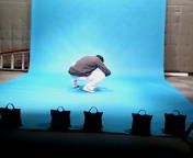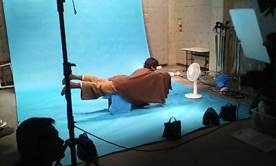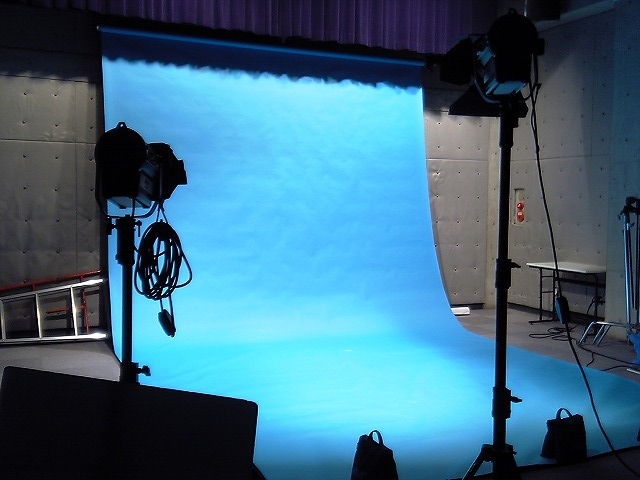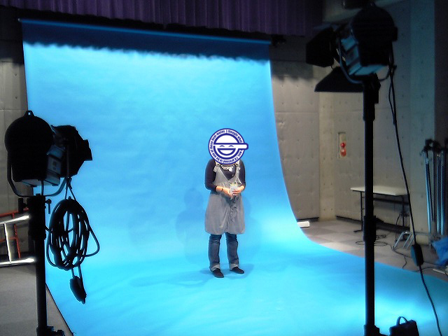 いやぁ~なんだかんだ言っても大学ですね、結構しっかりしたスタジオ備えてましたよ。 今回の授業内容は、スタジオでの照明と各種スクリーンの使用方法について。 この講習を無事受けると、スタジオのライセンスが発行されて、空いている時ならいつでも利用できるようになるわけです。 こんな感じのスタジオ、照明をすべてつけ、ブルースクリーンを敷いたところ。 決して大きいとは言えませんが、照明等の設備は整ってました。 ただし「ほぼ手動」ですけど(笑) 人が立つとこんな感じ。 強力な照明なだけあった、人物が際立ちます。 (大人の事情で顔にはマスクを施してます。) あとはこれを撮影して、ブルースクリーンの部分をパソコンでの編集で抜き、別の映像に合成するわけです。 今回の講習は、これがテーマ。 一人一ネタ、15秒程度のものを考えてきて、撮影、編集するというもの。 私は明日やる予定です(笑) 今日の分は、説明の時間などがあったため、3人しか出来なかったのですが、その一つでアリトが空飛んだりしてました(笑) いやぁ~完成映像が楽しみです!