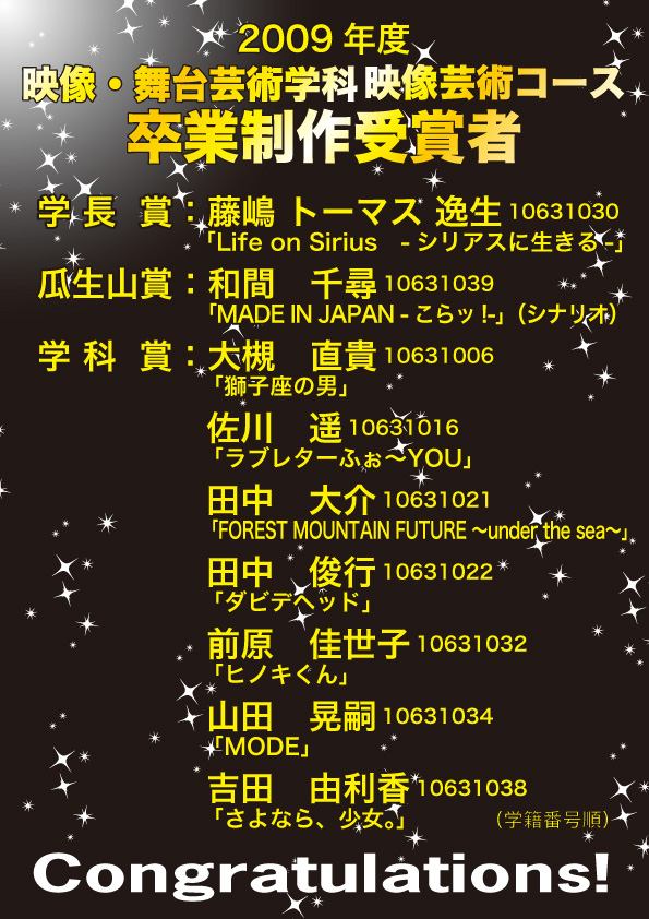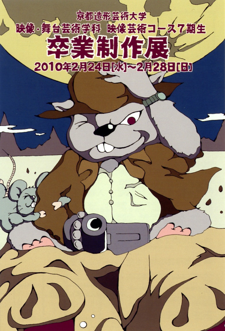 京都造形芸術大学 卒業制作展 2010年2月24日~2月28日 京都市美術館 (映像・舞台芸術学科は101、102号室) 合評から一ヶ月、たったのか?いや、そんなはずはない。 明日からはいよいよ学生最後のイベント、卒業制作展覧会。 ・・・いや、そんなはずはなi(以下略 クソ高いプロジェクターをクソ高い脚立に設置し終え、チェックとかをしている日常の風景 「獅子座の男(HEAVENS' RAID)」も一応上映されますが、結局合評から全くやる気がおきなかったので、ほとんど変わってません笑、あしからず。 でも入り口のテレビで、なつかしの映像を使って即興で作った学科ロゴ映像とか流れてるので何かしら新しいものは見れるかと。名前とかは書いてないですが10点も出したので一分ねばればなんか見れると思います笑 あ、それはそうと、先日発表された卒業制作のなんかよくわからない賞に「獅子座の男」が入賞しました。 『学科賞』、だそうです。まぁ学校関係のことなので、たいして興味ないですが未完成というスタンスを理解してもらえたものだと勝手に思っておきます。 張り出されている相変わらず悪趣味なポスター そんな「獅子座の男」は以下のスケジュールで上映されます! 25日 12:30~13:35 26日 14:30~15:35 美術館での展覧会内という映画の上映には最低の環境ですが、でかいスクリーンと苦情が来ても決してボリュームをしぼらない不屈の精神を持って上映しますので、是非起こしください。 時間が合わない方はDVDを全作品用意してありますので個別ブースで好きなときに見ていただくことも可能です。(でもやっぱあの作品は爆音の空気圧を感じてこそなので、上映する方をお勧めします。) まぁてな感じで、要するに来るだけ来いやぁ!!っつーことです。私も大体いると思いますので是非。 ・ ・ ・ 「こ、これは!まさかぁ!!」 to be continued